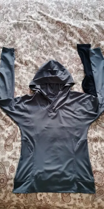 ткань жестковата, не знаю еще как будет после стирки. на 90-64 сидит хорошо. цвет в реале более глухой, грязновато-розовый скорее, а не фиолетовый. капюшон полноразмерный..