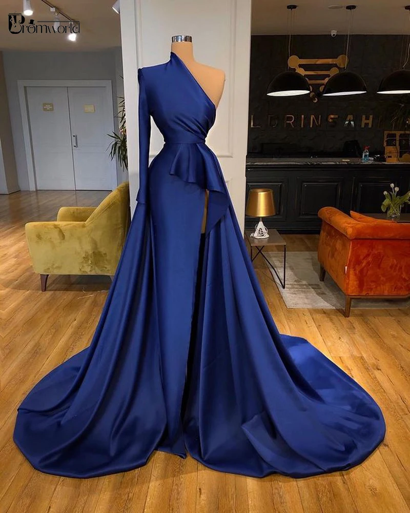 Желтые платья на выпускной с длинным рукавом на одно плечо... US $108,50US $155,00 Abendkleider марокканский кафтан мусульманские Вечерние платья Русалка с длинным рукавом атласные Арабский Дубай Королевский Синий Формальные платья Vestidos
