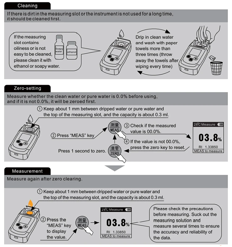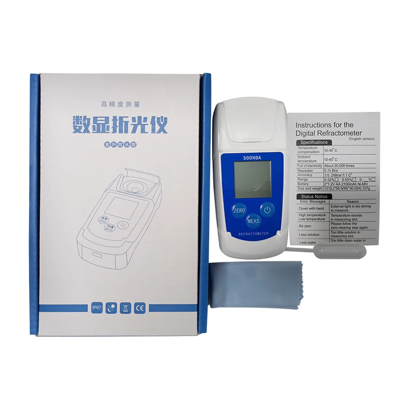 Разрешение 0,1% по шкале БриксаТемпература окружающей среды 10-40cКомпенсация температуры 10-40cОколо 20000 раз полной зарядкиТочность + - 0.2% Brix / + - 1CДиапазон измерения 0-55%Батарейки 2 * AA (батарейки в комплект не входят)Размер 121*58,5*30Вес 127 г