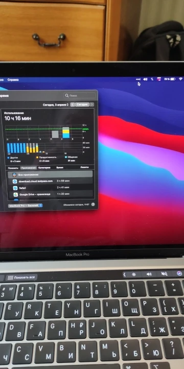 Чип Apple M1 преображает возможности MacBook Pro 13 дюймов. В этот чип интегрирован целый ряд компонентов. Это 8?ядерный процессор, который прекрасно справляется со сложными задачами в области фотографии, программирования, видеомонтажа и не только. Потрясающий 8?ядерный графический процессор, с которым обработка сложной графики происходит мгновенно, а игры просто летают. Мощная 16?ядерная система Neural Engine, которая поднимает машинное обучение на новый уровень в ваших любимых приложениях. А также сверхскоростная объединённая память, благодаря которой всё происходит быстро и плавно. И при этом компьютер работает до 20 часов без подзарядки - дольше любого другого Mac(время работы от аккумулятора зависит от конфигурации и характера использования устройства).Это самый популярный ноутбук от Apple для профессионалов. Теперь ещё более мощный. Ещё более продвинутый.