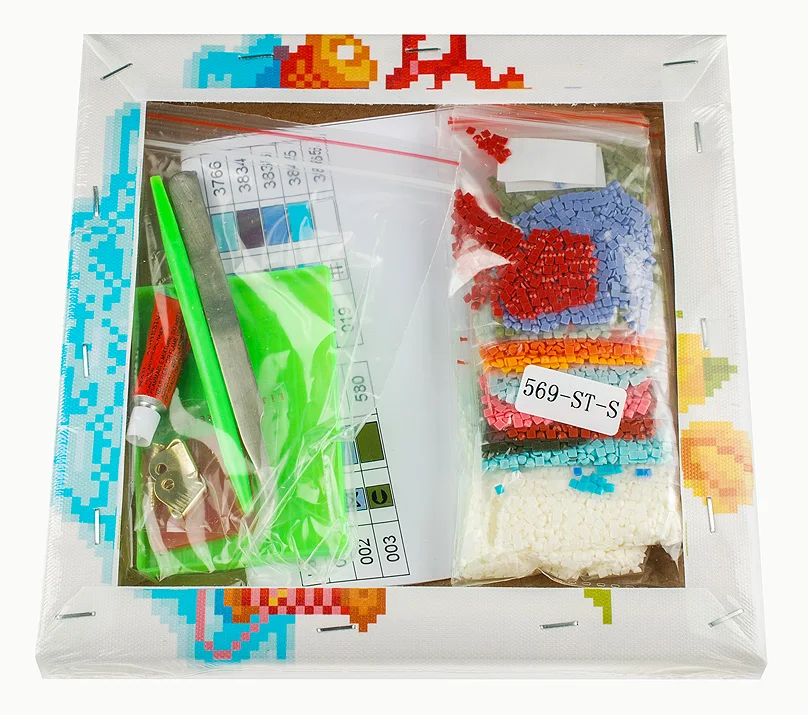 По авторскому сюжету Елены Ковалевой вам предстоит выполнить яркую картину в формате 20*20 см. В нашем творческом наборе вас ожидают: холст с напечатанной цветной схемой и условными обозначениями, комплект огранённых акриловых камней, лоток с ячейками, пинцет, дополнительный тюбик клея, листовка-ключ и крепления для подвеса на стену.