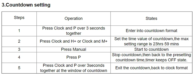 Функция:1. Отображение часов (формат 12hr / 24hr)2 таймераОбратный отсчет 3 Особенности:1. Легко читаемый ЖК-дисплей, светодиодный индикатор.2,16 программ включения/выключения каждый день, 15 комбинаций в неделю.7 дней в неделю, 3,24 часов в день программируемый.4. Функция обратного отсчета. Отсчет до 24 часов.5. При сбое питания Встроенный перезаряжаемый аккумулятор используется для резервного копирования памяти (сохраните программу, которую вы установили).6. Повторите программу из 16 настроек включения/выключения, а затем включение/выключение вручную.7. Очень подходит для использования в панельных домах.