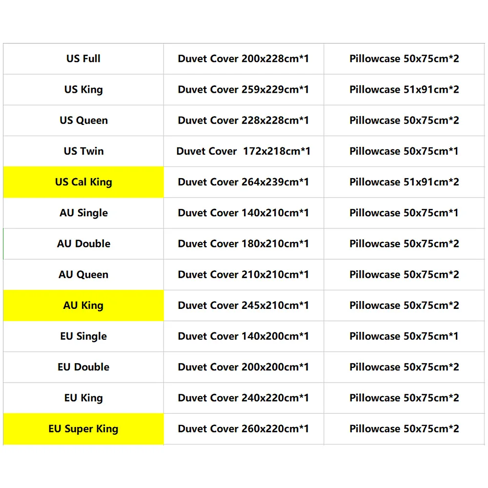 * Примечание: температура глажки не должна превышать 140 °C. * Из-за шитья и термопереноса, ручное измерение, размер будет иметь погрешность в 5-8 см. (Комплект постельного белья не включает наполнение). США Twin: 1 пододеяльник 172x218 см, 1 Наволочка 50х75 см. США: 1 пододеяльник 200x228 см, 2 наволочки 50x75 см. Королева США: 1 пододеяльник 228x228 см, 2 наволочки 50х75 см. Американский Король: 1 пододеяльник 259x229 см, 2 наволочки 51x91cm. US Cal King: 1 пододеяльник 264x239 см, 2 наволочки 51x91cm. AU Single: 1 пододеяльник 140x210 см, 1 Наволочка 50х75 см. AU Double: 1 пододеяльник 180x210 см, 2 наволочки 50х75 см. AU Queen: 1 пододеяльник 210x210 см, 2 наволочки 50х75 см. AU King: 1 пододеяльник 245x210 см, 2 наволочки 50х75 см. Европейский стандарт: 1 пододеяльник 140x200 см, 1 Наволочка 50х75см. Европейский размер: 1 пододеяльник 200x200 см, 2 наволочки 50x75 см. ЕС Король: 1 шт. пододеяльник 240x220 см, 2 шт. наволочка 50x75cm. Супер король ЕС: 1 пододеяльник 260x220 см, 2 наволочки 50х75 см. Наволочка: 1 шт. 50x75 см, или 1 шт 51x91cm. * Это изображение дизайна комплекта постельного белья. Не фактический образ, так что может выглядеть немного по-другому в реальной жизни. Это может немного отличаться между товаром, который вы видели с реальным товаром, из-за различных экранов монитора, солнечного света, фона. * Этот комплект постельного белья изготавливается на заказ. Но он будет доставлен очень быстро, и вы получите номер отслеживания, когда он будет отправлен.