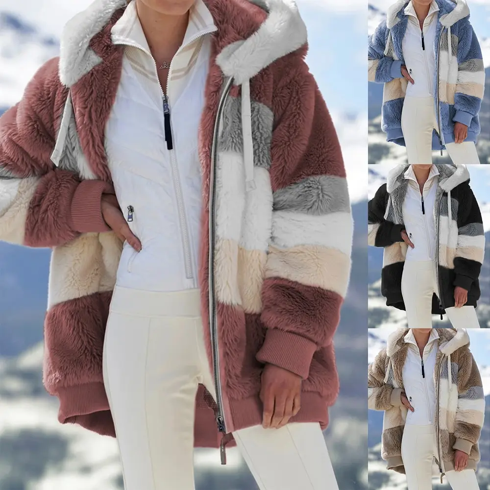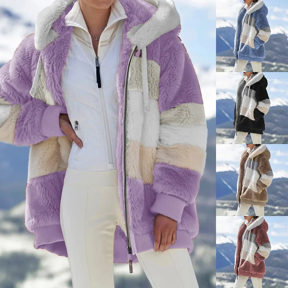 Куртка женская зимняя в стиле оверсайз, модная плюшевая пэчворк куртка на молнии с капюшоном и карманами, свободная пальто в стиле ретро с длинным рукавом, 2021