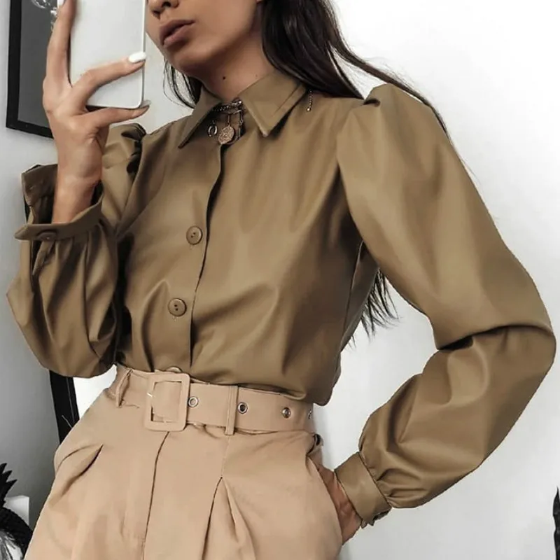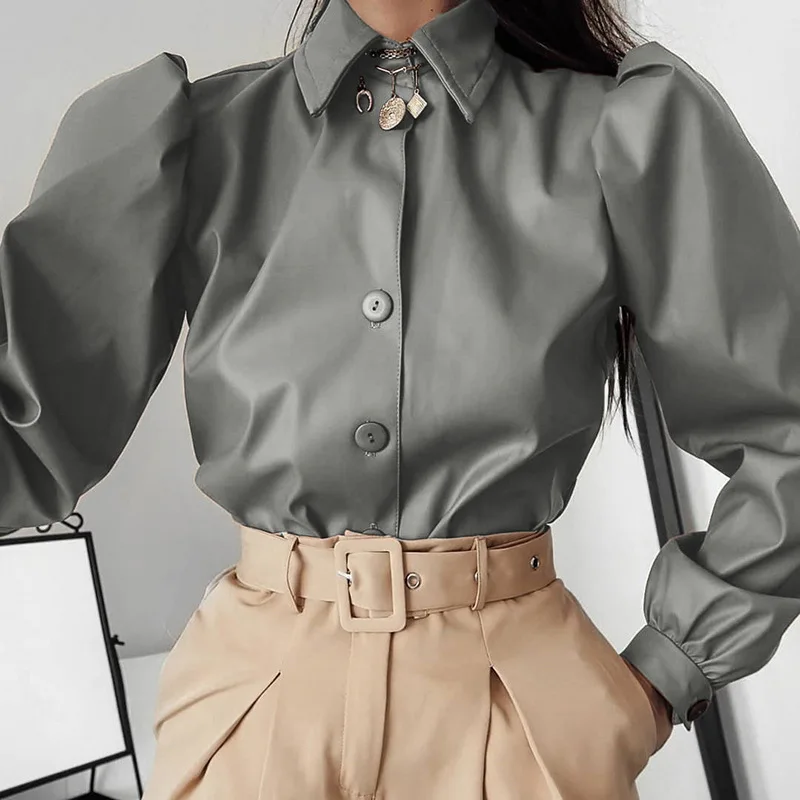 Женская рубашка на осень и зиму, женский новый элегантный пикантный однотонный топ в стиле ретро из искусственной кожи с пышными рукавами и длинным рукавом, рубашка из искусственной кожи
