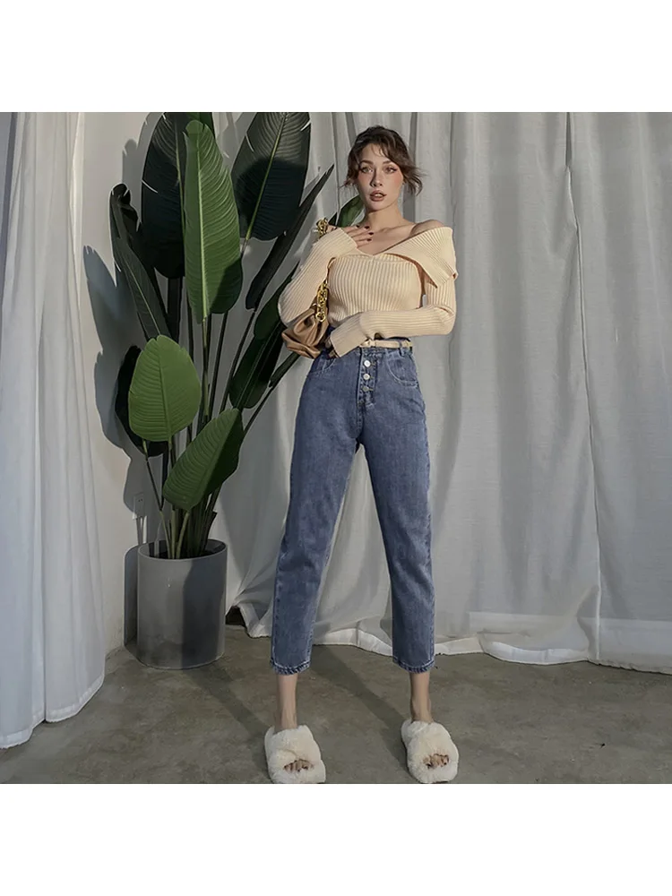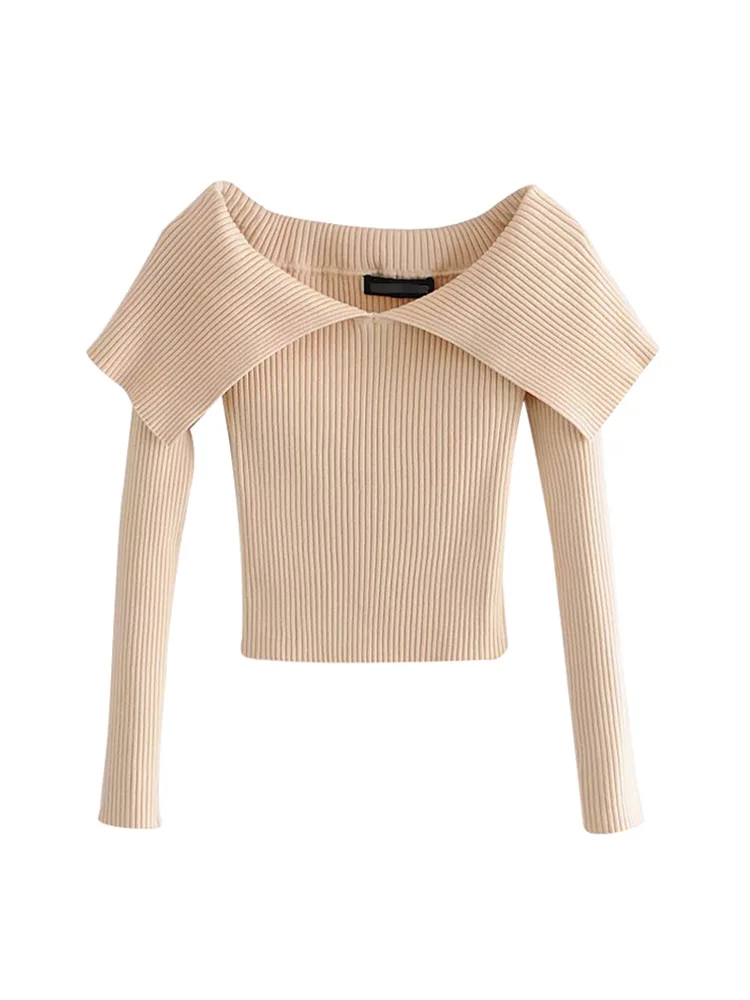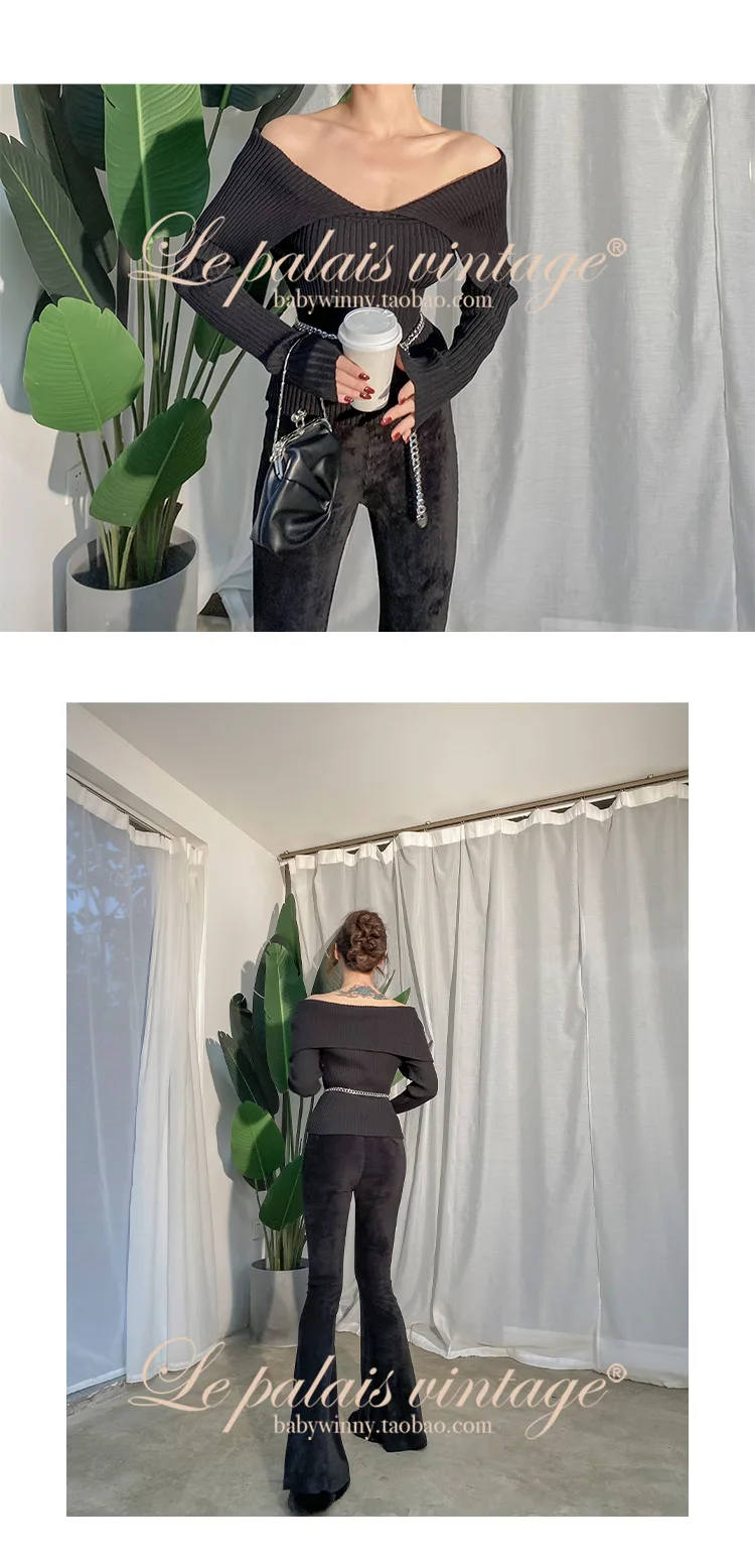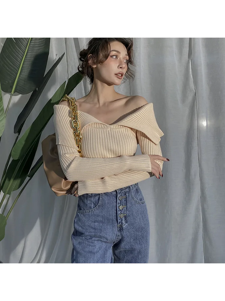 Осень-зима 2020, новый тонкий женский однотонный эластичный свитер с v-образным вырезом и открытыми плечами, повседневные модные вязаные уличные топы, подходящие ко всему