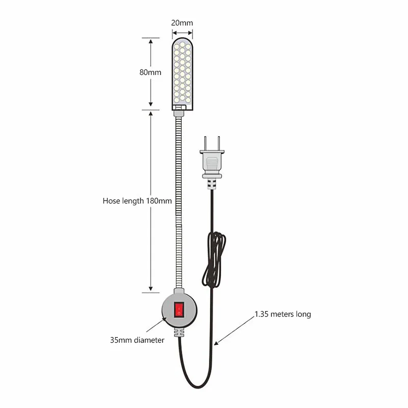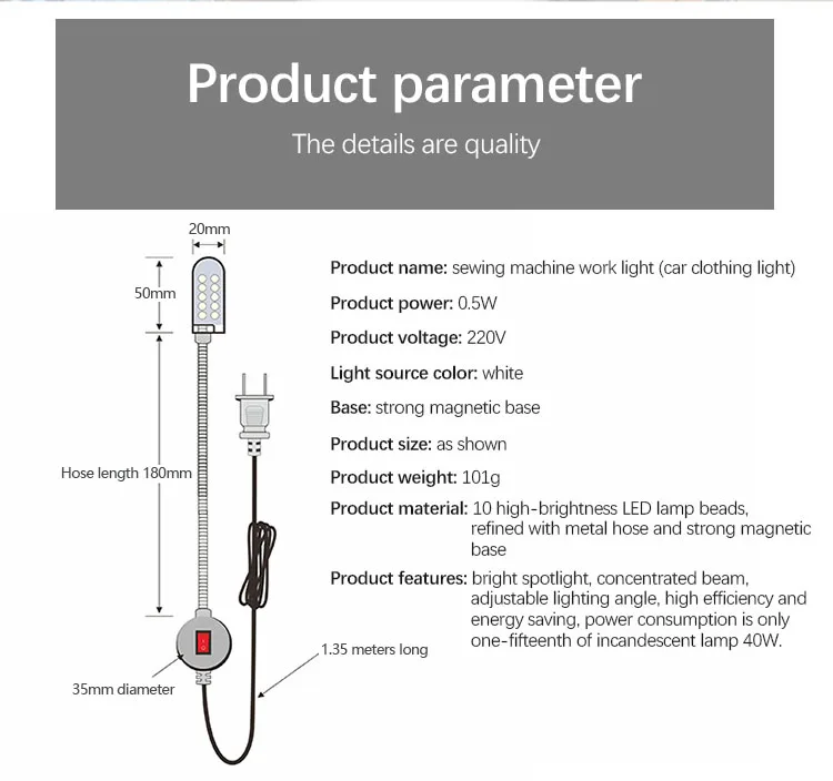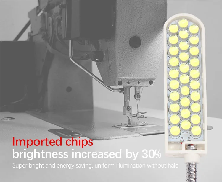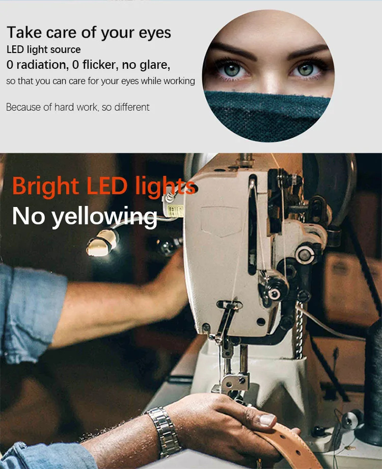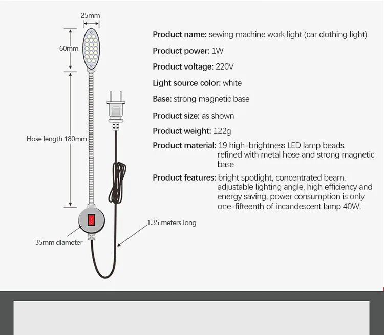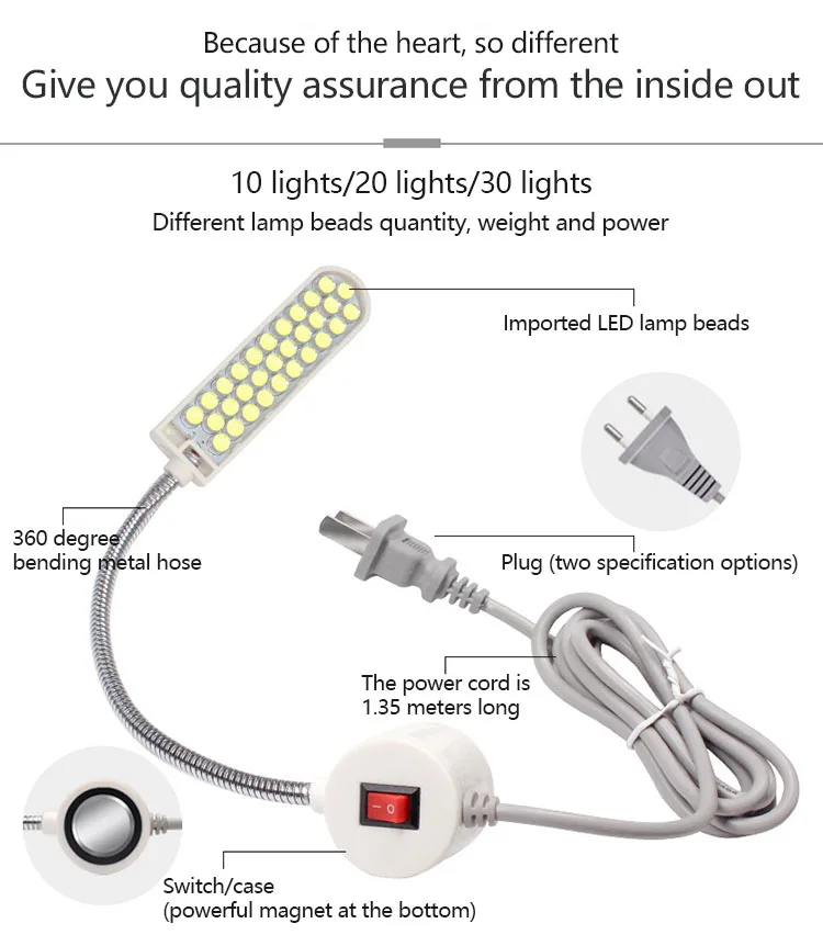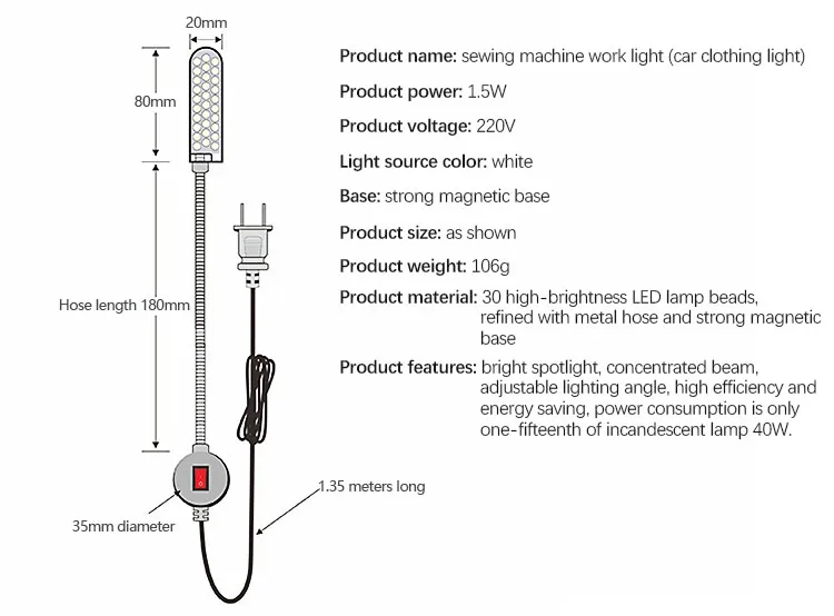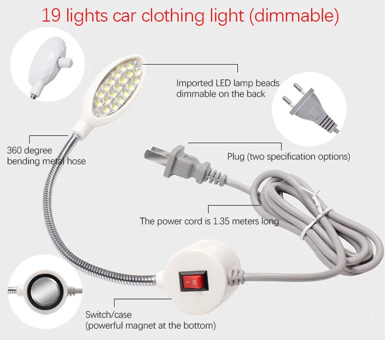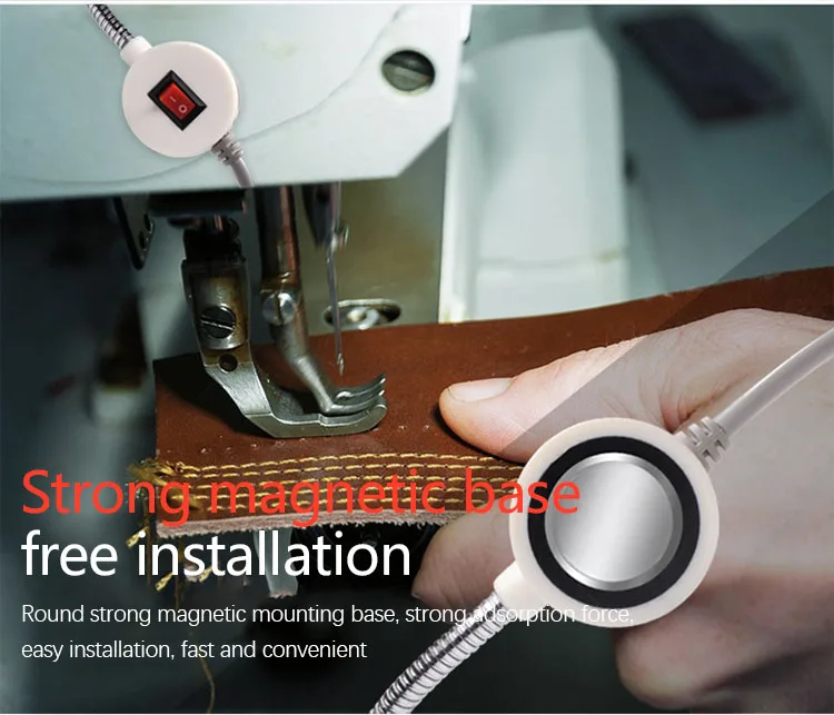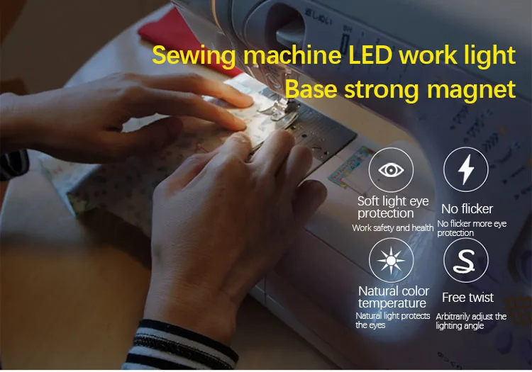 Особенности:1. Имеет прочный пластиковый корпус лампы, безопасный и экологически чистый в использовании.2. Магнитное основание легко установить и удалить и прочно закреплено на швейной машине или любой металлической поверхности.2. Гибкая горловина позволяет точно регулировать светильник в соответствии с вашими потребностями. Светильник легко установить в нужное положение.