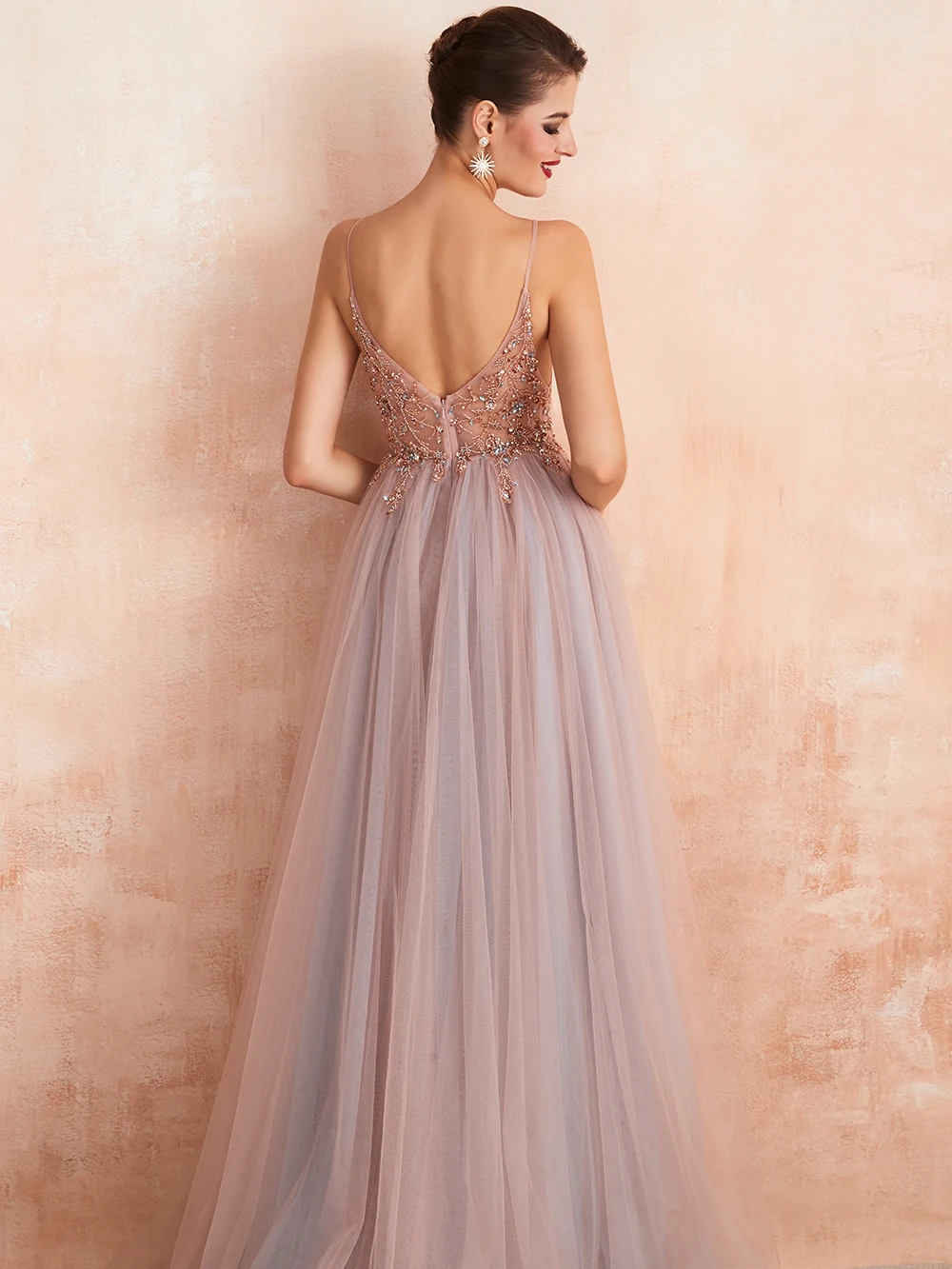 Длинные вечерние платья трапециевидного силуэта, с V-образным вырезом, на тонких бретелях, расшитые бисером, с высоким разрезом без спинки
