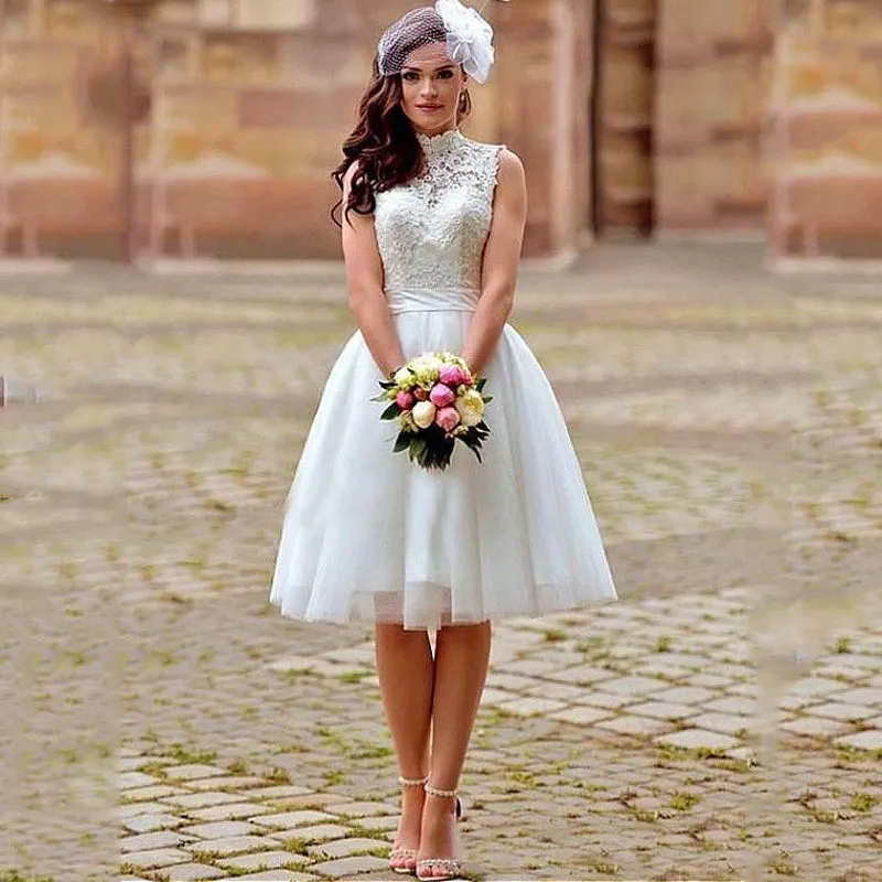 Свадебное Платье До Колена 2021 ТРАПЕЦИЕВИДНОЕ белое кружевное свадебное платье с высокой горловиной и аппликацией Boho Короткие свадебные платья с открытой спиной