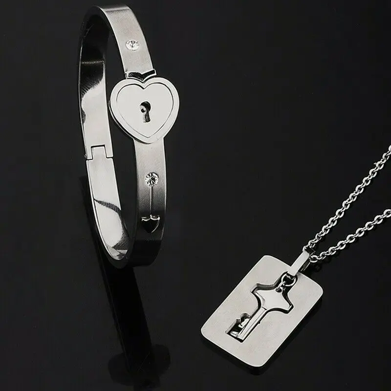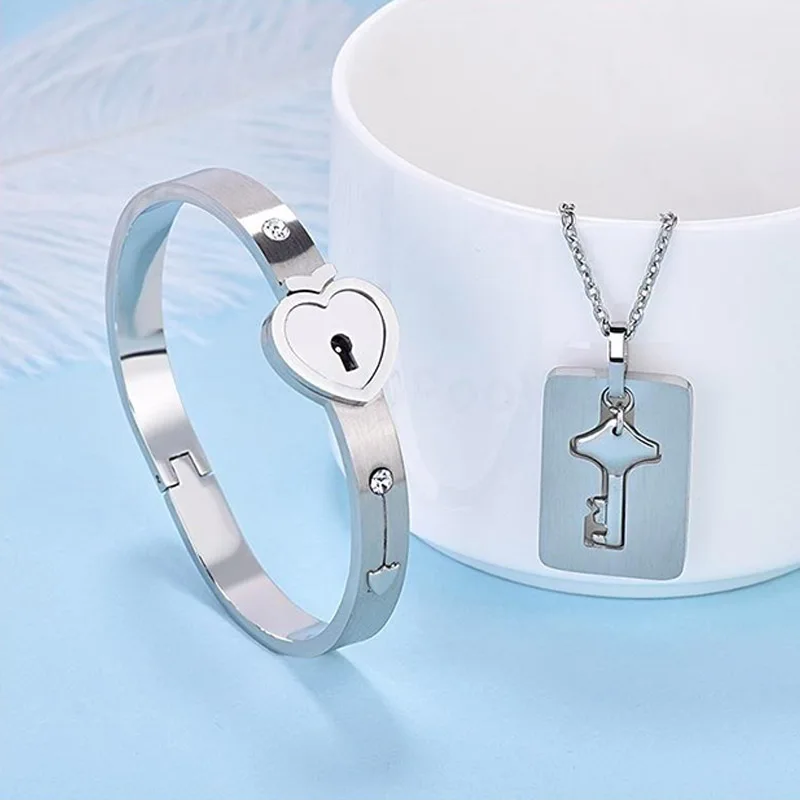 Набор из браслета и ожерелья с подвеской в виде сердца и ключа из нержавеющей стали