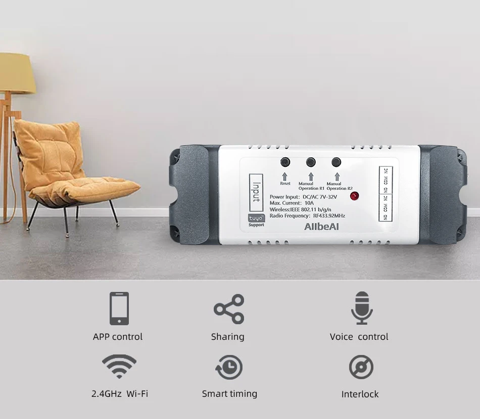 【APP пульт дистанционного управленияВы можете управлять подключенным бытовым прибором в Tuya или smart life APP в любом месте и в любое время. Например, светильник, электрический чайник, электрическая рисоварка, электрический занавес и т. д.【 RF433 управление】Модуль WIFI поддерживает частоту RF433, и вы можете управлять модулем WIFI с помощью пульта дистанционного управления RF433mhz.【Управление для мобильного телефонаКак только вы добавить устройство в приложении, 2,4 ГГц WI-FI, вы можете управлять устройством в вашем смартфоне 2G/3G/4G сети мобильной связи или WI-FI.(Примечание: маршрутизатор должен быть в сети, а модуль WIFI должен поддерживать близкое расстояние с маршрутизатором)【Голосовое управление 】Совместим с Alexa и Google Assistant, вы можете использовать Голосовое управление, чтобы включить/выключить подключенные бытовые приборы.【Share Control】Одно устройство может управлять несколькими телефонами, вы можете поделиться модулем Wi-Fi с вашей семьей. Поэтому ваш член семьи также может управлять модулем.【Групповое управлениеОдин телефон может управлять несколькими смарт-устройствами. Вы можете добавить модуль wifi и другие смарт-устройства в группу, а затем включить/выключить все смарт-устройства одновременно.