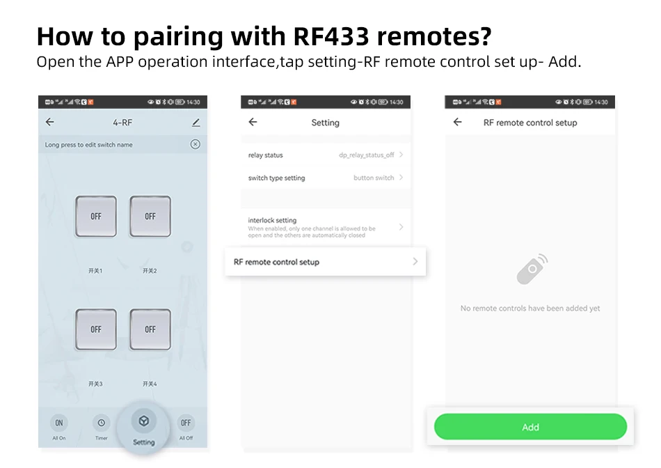 Откройте приложение Tuya Smart или Smart LifeНажмите «Настройка»> «Настройка радиочастотного дистанционного управления»> «Добавить»Когда появится быстрый интерфейс, вам нужно нажать кнопку пульта ДУ в течение 2 секунд.Затем ослабьте кнопку, и она успешно завершит сопряжение.