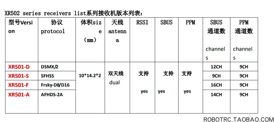 Особенности:1) супер маленький размер (10,0*14,2*2,0 мм);2) Супер светильник (0,65 г);3) со встроенным 13dBm LNA;4) двойная антенна;5) Может использоваться на любых досках управления полетом;6) двойная антенна может быть согнута в любом направлении и не сломана;7) Поддержка выхода RSSI;8) поддерживает выход SBUS и PPM(22ms) одновременно;9) Версия F поддерживает протокол смеси (D8 и D16);Операция привязки: нажмите переключатель привязки после включения приемника XR6OO, он переходит в режим привязки через 2 секунды, когда медленно мигает красный светодиодный индикатор быстро мигает. Затем Свяжите приемник в соответствии с руководством передатчика. Когда быстро мигает красный светодиодный индикатор становится ярким, это означает, что Привязка успешна.Технология Variable RF Link технология: когда приемник находится слишком близко к радио (дистанционное управление), обычно радиочастотный сигнал будет заблокирован и между тем происходит потеря контроля, переменная RF ссылка рождается для решения проблемы! Как только Variable RF Link обнаружит, что приемник приближается к радио, он отрегулирует коэффициент усиления LNA и выходную мощность PA ниже, чтобы избежать короткой дистанции управления отказом автоматически; когда Variable RF Link обнаруживает, что приемник находится далеко от радио, Он будет регулировать коэффициент усиления LNA и выходную мощность PA выше, чтобы автоматически увеличить Рабочий диапазон RX. Выход сигнала RSSIДва способа выхода сигнала RSSI:1) сигнал SBUS: выход сигнала RSSI находится на No.16 канале (AUX12) SBUS;2) сигнал PPM: выход сигнала RSSI находится на No.9 канале PPM;Протокол смесь (только для XR502-F версии): XR502-F версия может поддерживать протокол D8 и D16 FrSky, клиент может решить, какой из них хотел бы использовать во время привязки. Постоянный ярко-синий светодиодный, привязка преуспевает, указывая, что RX с протоколом D16; Если синий светодиодный выключен и привязка успешна, указывая RX с протоколом d8.