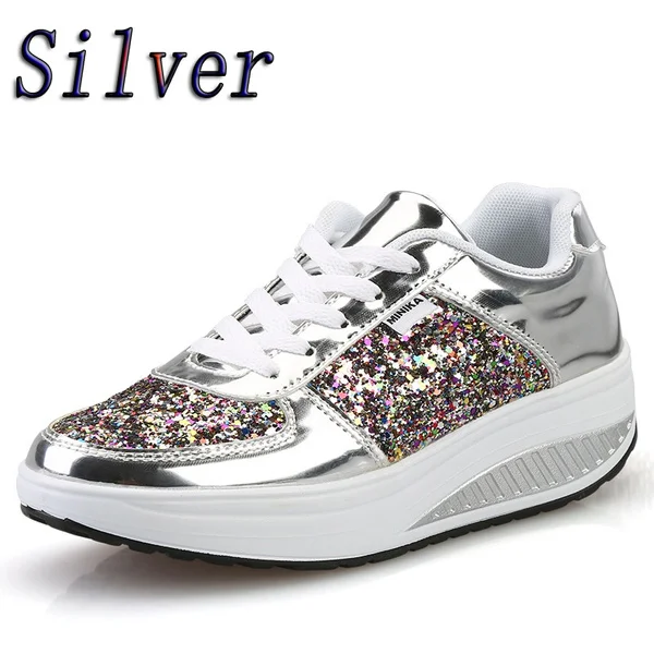 (Европейские размеры 35 42), бесплатная доставка женские кроссовки с блестками туфли на Покатой подошве модные спортивные ботинки для девушек; Обувь для фитнеса (Цвет: золотой, белый, серебристый)
