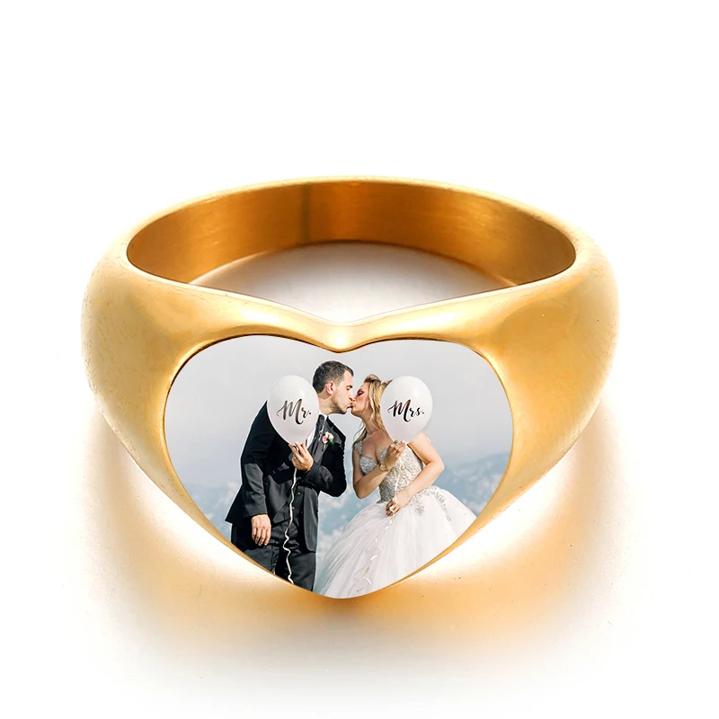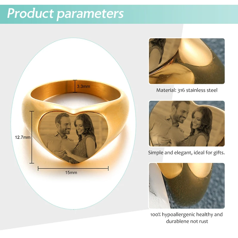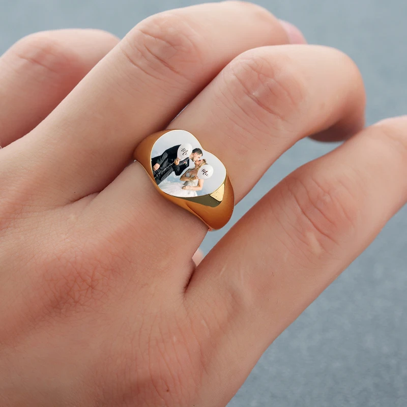 Sadly I cannot recommend this product. I expected the photo to be siliconed on the ring not just glued my photo fell off within the hour of wearing. It is the second ring I purchased the first ring was engraved and wrong size but engraving looked much like a dirty mark on the ring and I tried to clean it as I couldn't see the etching then realised it was not a dirty mark but the engraved picture and it was not great quality. These would be fine if you just want a ring to wear on occassion but not an everyday wear or in garden or dishes ring. or housework they are not hardy