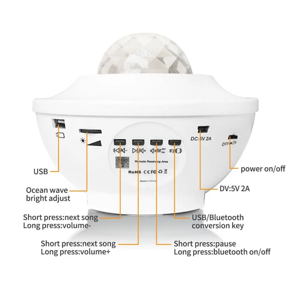 Сочетание четырехцветной лампы водяного знака и зеленого лазера. Водяной знак имеет четыре цвета: красный, белый, синий и зеленый. Цвет лазера зеленый. Пульт дистанционного управления может регулировать цвет водяных знаков, скорость водяных знаков, режим водяных знаков, режим Bluetooth, одно управление водяных знаков, одно лазерное управление, яркость, управление музыкой, управление звуком, режим выбора, функция таймера, переключение, любой мобильный телефон или другие устройства могут быть подключены к Bluetooth без проверки.