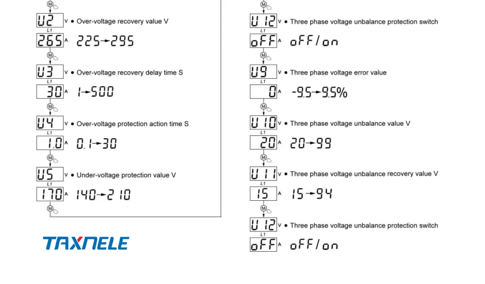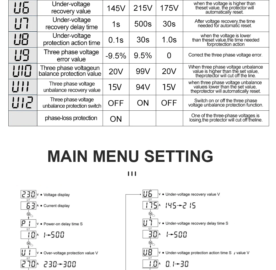 Функции: 1. Защита от перенапряжения 2. Защита от низкого напряжения 3. Автоматическое восстановление 4. Дисплей напряжения (измерение напряжения) 5. Трехфазный Ампер защита от несбалансирования 6. Защита фазовой последовательности (защита обратной фазы) 7. Защита от разрыва нулевой линии 8. Защита от фазового сбоя Параметры продукта: 1. Номер модели: TVPS3-V 2. Мощность питания: 3*230V / 400 В переменного тока, 50/60 Гц 3. Макс. Мощность загрузки: 63A 4. Диапазон защиты от перенапряжения: 230 В ~ 300 регулируется (по умолчанию: 270 в) Диапазон значений перенапряжения: 225 в ~ 295 в (по умолчанию 265 В) Предохранение от перенапряжения время действия: 0,1 ~ 30 секунд (по умолчанию 1) 5. Диапазон защиты от низкого напряжения: 140 в ~ 210 в регулируемый (по умолчанию: 170 в) Диапазон значений восстановления под напряжением: 145 В ~ 215 в (по умолчанию 175 в) Защита от пониженного напряжения время действия: 0,1 ~ 30 секунд (по умолчанию 1S) 6,3 фаз Вольт в случае отключения вентилятора значение: 20-95V adjustabe OFF 7. Время задержки после включения питания: 1 ~ 500 секунд (по умолчанию: 10s) 8. Время задержки восстановления: 1 ~ 500s (по умолчанию: 30s) 9. Установка: 35 мм din-рейка