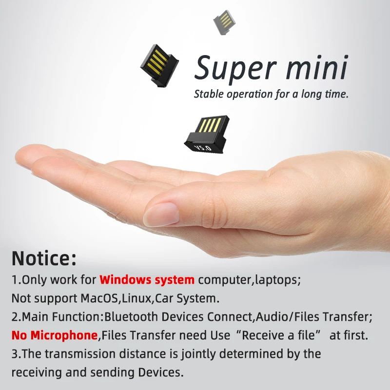 -Супер Мини Размер-Поддержка plug and play-Универсальный порт USB 3,0 2.0, работает стабильно долгое время.-Поддерживает одновременное подключение нескольких устройств.-Чип Bluetooth 5,0, низкая мощность BLE.-Совместимость с V4.2 V4.1 V4.1-Использование для мобильный телефон, беспроводная eraphone, гарнитура, геймпад, мышь, клавиатура, клавиатура, принтер и т. Д. Bluetooth-устройства