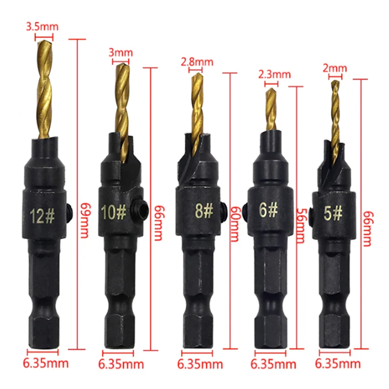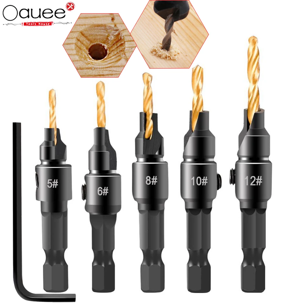 Набор сверл для столярных работ, комплект из 5 насадок с зенкером для сверления пилотных отверстий для винтов размером #5 #6 #8 #10 #12, инструменты для деревообработки