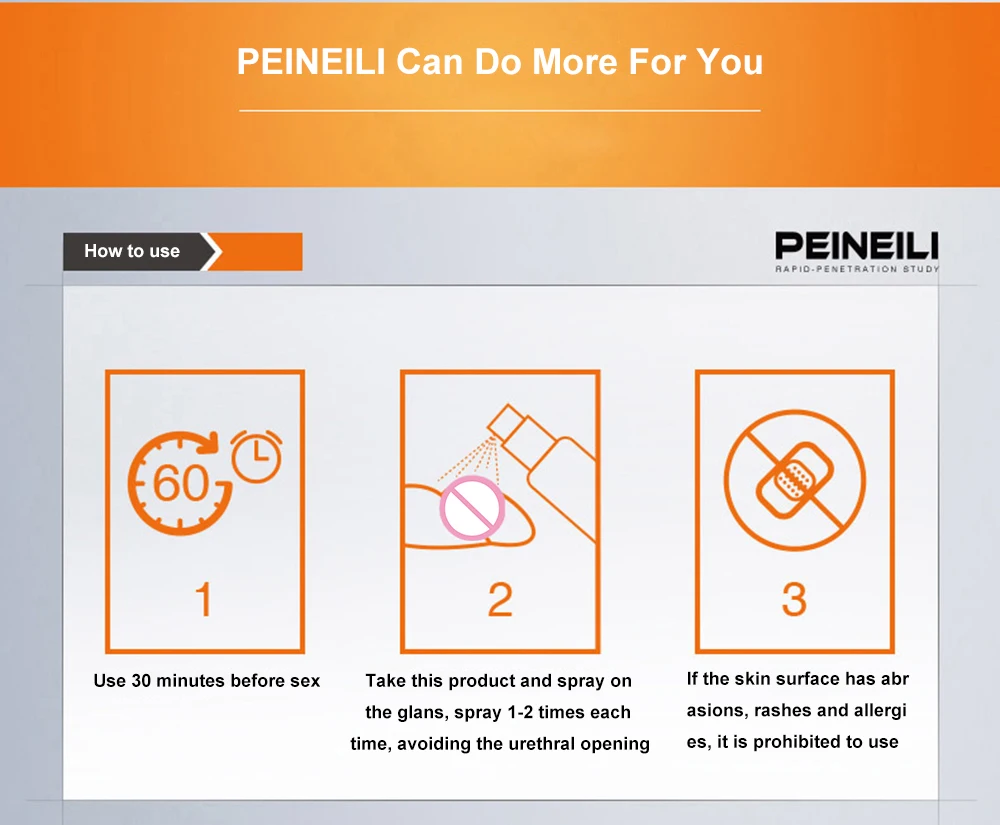 Спрей на пенис и коронарный сулькус с этим продуктом за 30 минут до полового акта, затем равномерно распределить, этот продукт действителен около 60 минут.