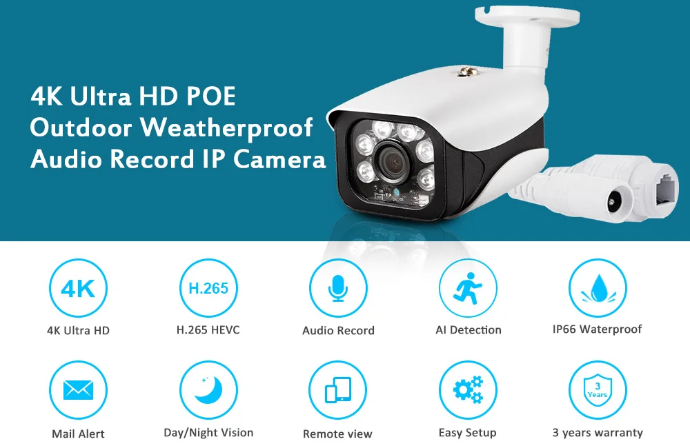 1, Ультра HD 4K дисплей высокой четкости, расширенное H.265 Сжатие видео;2. Ультра HD 4K POE ip-камера, металлический материал, IP66 водонепроницаемый, подходит для внутреннего и наружного использования, надежная Домашняя безопасность;3. Поддержка питания через Ethernet, подключи и работай, простота установки;4. Поддержка аудиозаписи, все камеры встроены в микрофон;5. Поддержка ночного видения Ultra HD;6. Поддержка IR-CUT переключателя двойного фильтра, днем и ночью для достижения мониторинга, цвет не является частичным искажением цвета;7. Поддержка обнаружения движения, оповещения по электронной почте, воспроизведения видео и многоязычности;8. Поддержка Android,Iphone,Ipad,PC,VMS,P2P view;9. Удаленный доступ в любом месте, в любое время;10. Поддерживает функцию автоматического электронного затвора, адаптируется к различным условиям мониторинга;11. Миллион пикселей HD видео передача низкой стоимости, большое расстояние, без задержки, высокая эффективность, анти-помех и легко реализовать;12. Подходит для всех видов мест применения;