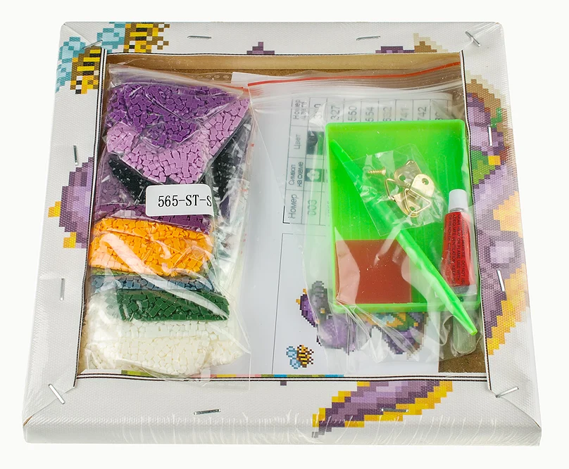 В нашем творческом наборе вас ожидают: холст с напечатанной цветной схемой и условными обозначениями, комплект огранённых акриловых камней, лоток с ячейками, пинцет, дополнительный тюбик клея, листовка-ключ и крепления для подвеса на стену.