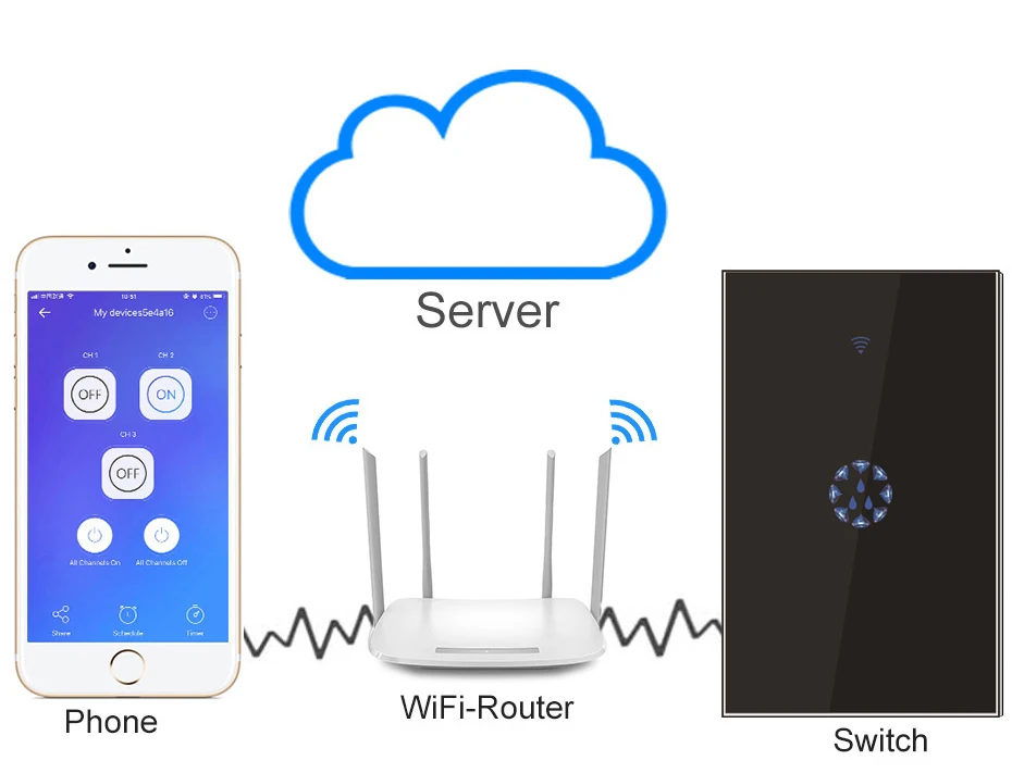 1. Smart Switch подключается к серверу через Wi-Fi и сообщает текущее состояние коммутатора, чтобы вы могли видеть реальный статус устройства на вашем смартфоне.2. Ваши команды управления загружаются на сервер через сеть телефона, и сервер передает команды управления на смарт-коммутатор. Переключатель запускает ваши команды включения или выключения.Пожалуйста, будьте уверены, что передача данных очень безопасна с помощью шифрования.