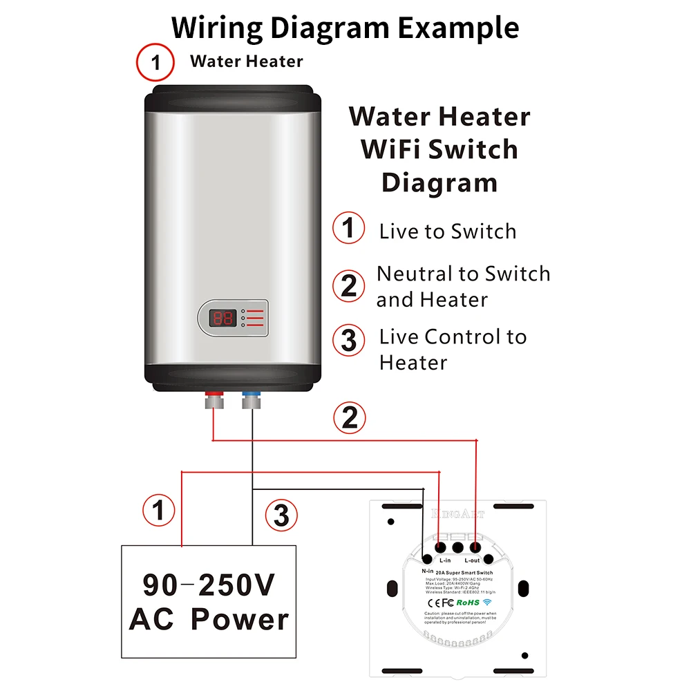 Прежде всего, переключатель нуждается в живом проводе и нейтральном проводе для обеспечения питания, как показано на рис. 1 и 3.Выходной провод выключателя соединен с входным концом водонагревателя, как показано на рис. 2 и 3.Пожалуйста, будьте уверены, что посылка содержит очень подробные инструкции. Кроме того, вы также можете спросить нас, мы сделаем все возможное, чтобы помочь вам.