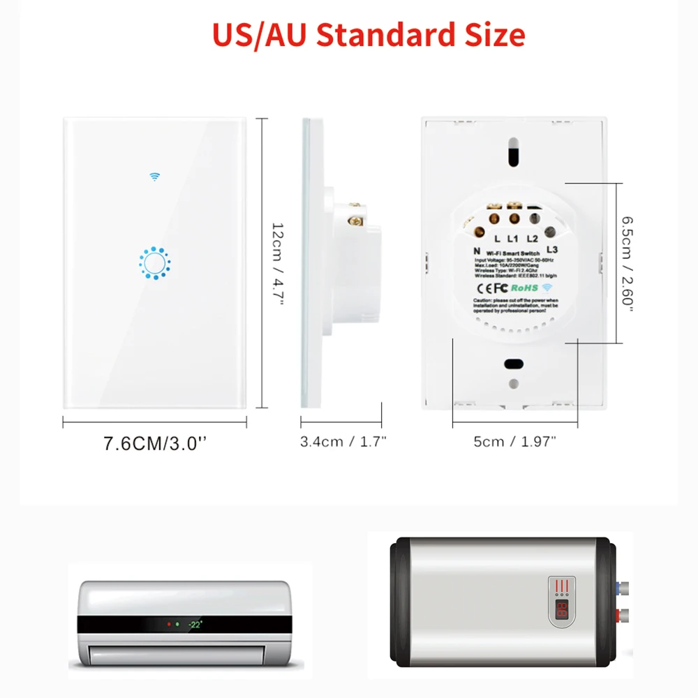 Тип: WiFi smart водонагреватель переключатель панельМатериал: закаленное стекло + АБС-пластикЦвет изделия: белый/черныйФункция: управление Wi-Fi, Совместимость с Amazon Alexa Echo Google Home AssistantПитание: от сети переменного тока 90-250 50/60 ГцМаксимальный ток: 20A / 250VМаксимальная мощность: 4400 ВтРабочая температура: -10 ℃-45 ℃ (14 ℉- 113 ℃)Рабочая влажность: ≤ 80%Приложение: Tuya Smart или Smart LifeРазмер: 120*76*34 мм (4,7*3,0*1,24 дюйма)Wi-Fi Тип: 2,4 ГГц 802.11b/g/nСертификация: CE, RoHS, FCC