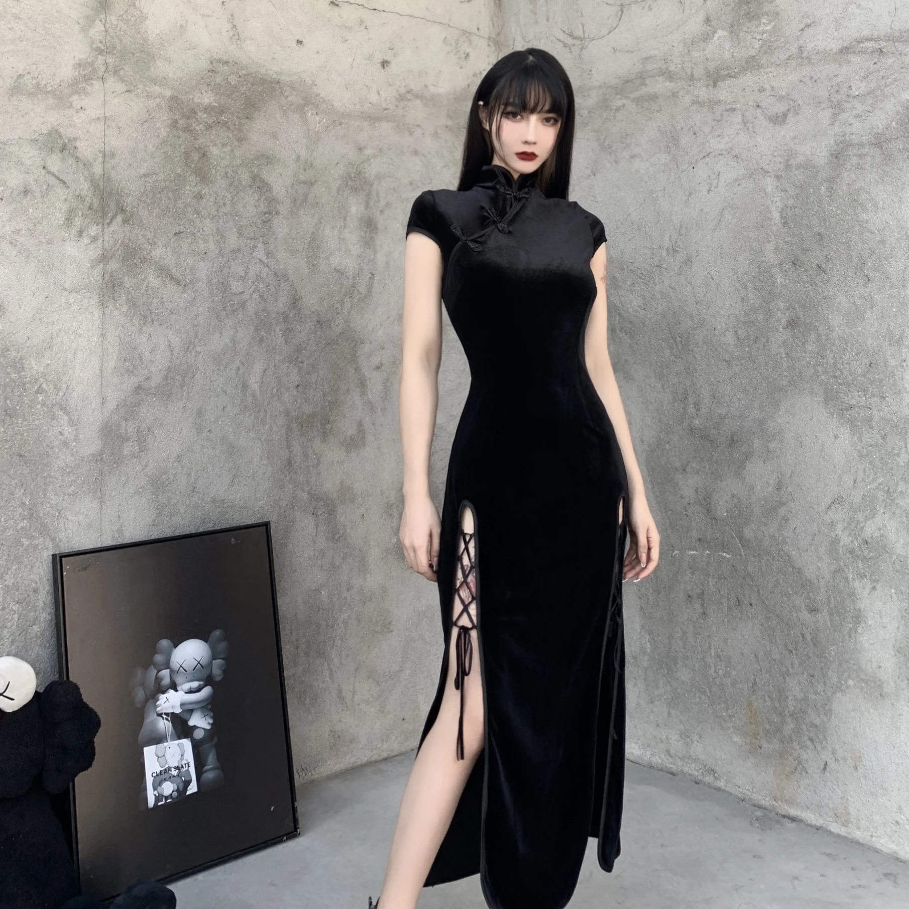 Женское платье-Ципао с коротким рукавом, готическое эластичное черное платье в китайском стиле ретро с высокой талией и разрезом на подоле