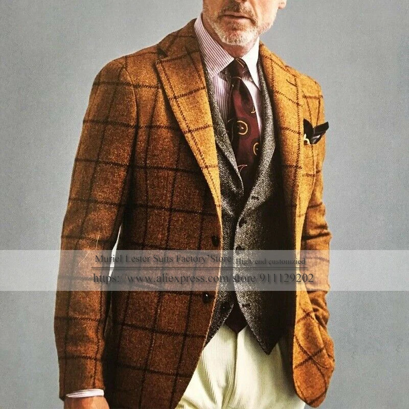 Классический твидовый оранжевый шерстяной Блейзер в клетку с узором гусиные лапки и вельветовые брюки мужские костюмы из 3 предметов для свадьбы официальный жакет 2021