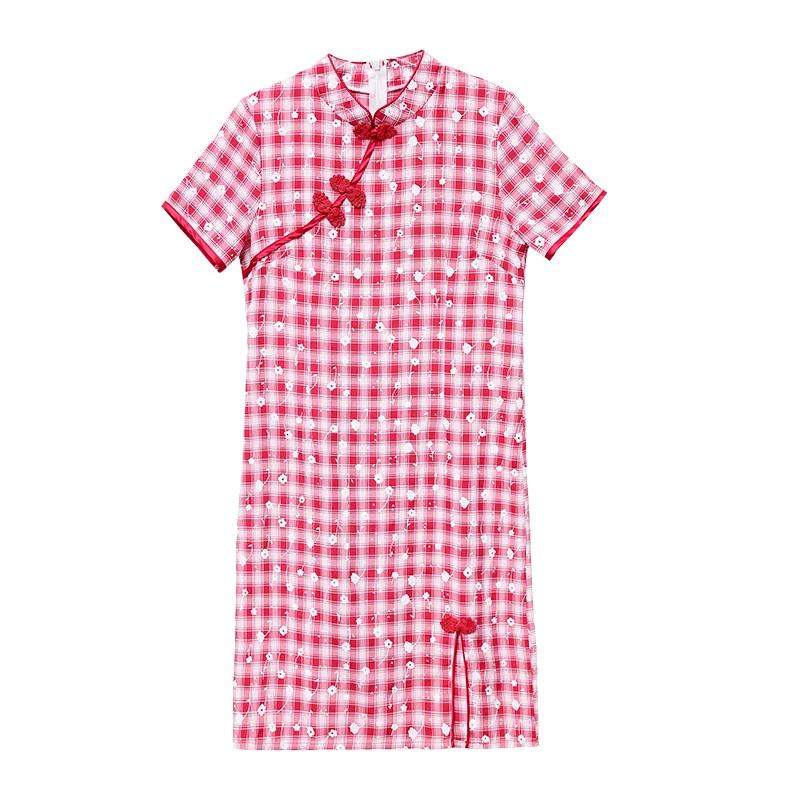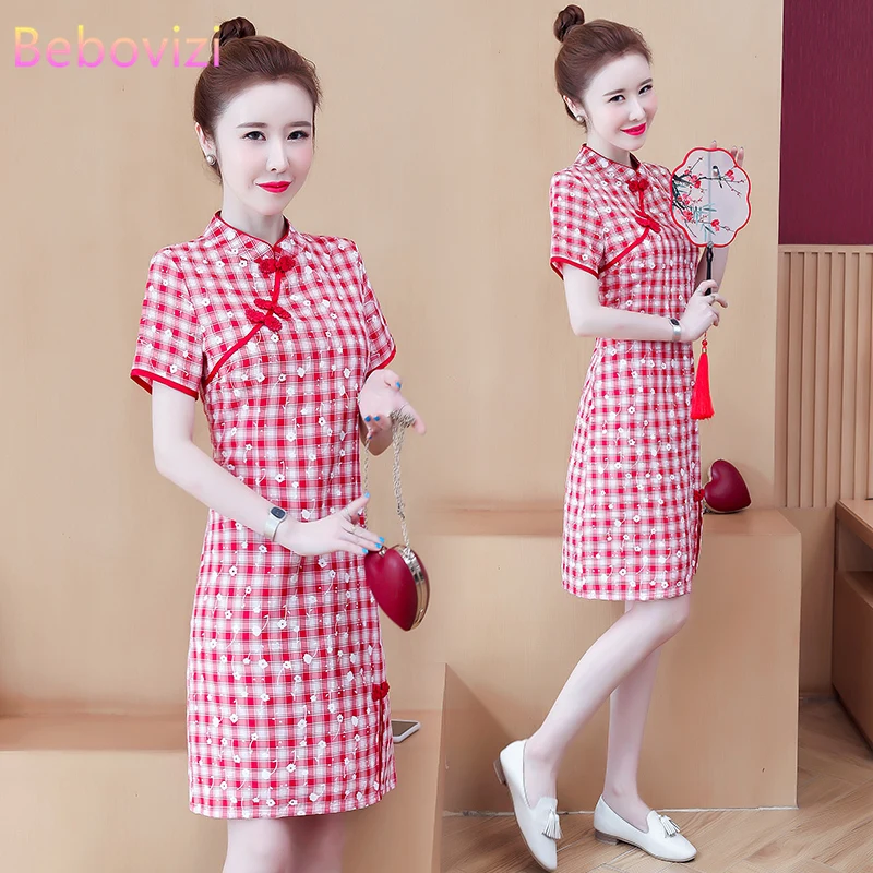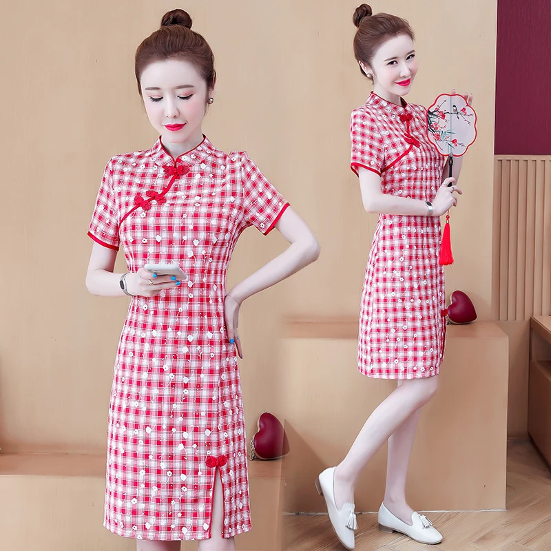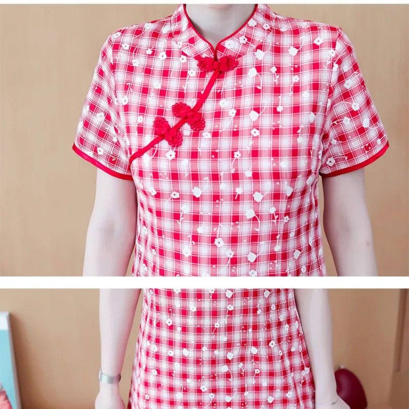 Женское праздничное платье Ципао, розовое клетчатое платье с коротким рукавом, традиционная китайская одежда, лето, размера плюс, M-4XL