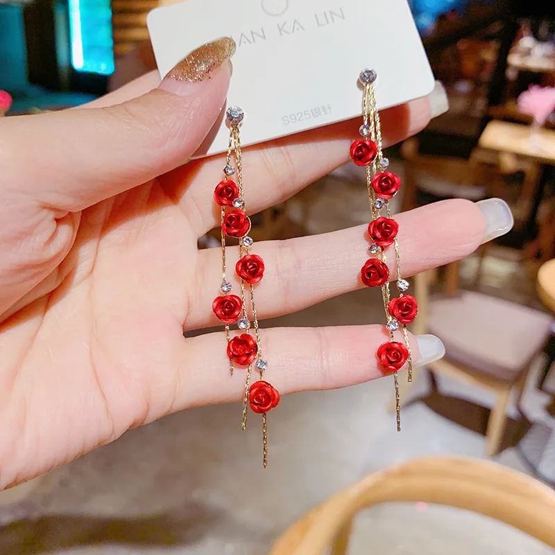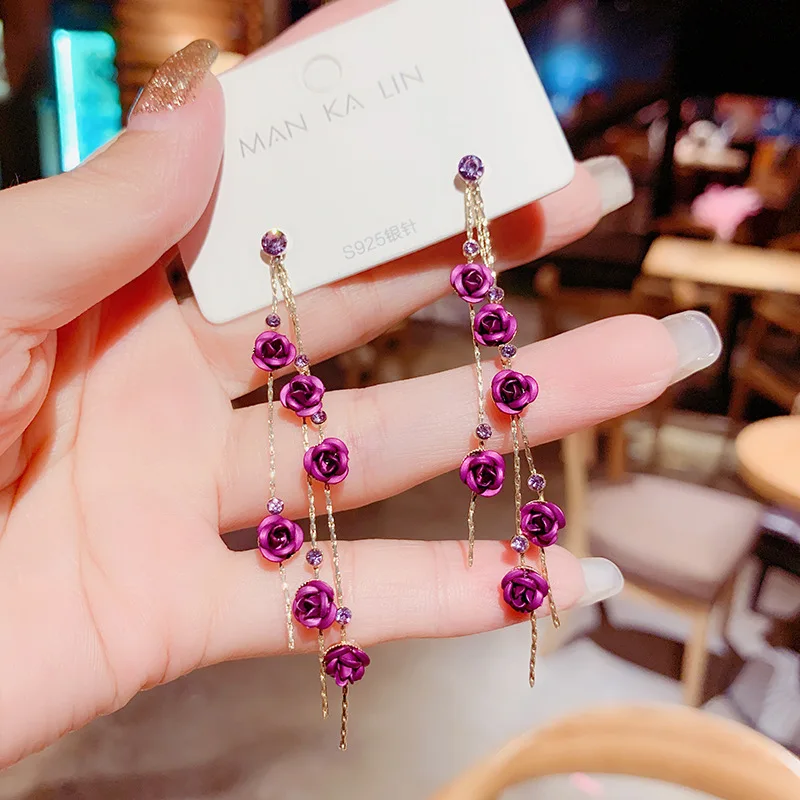 Корейские новые модные темпераментные длинные висячие серьги с кисточками изысканные простые фиолетовые маленькие серьги с цветком розы Ювелирные изделия в подарок