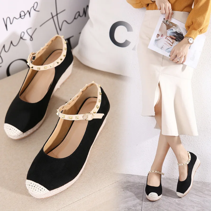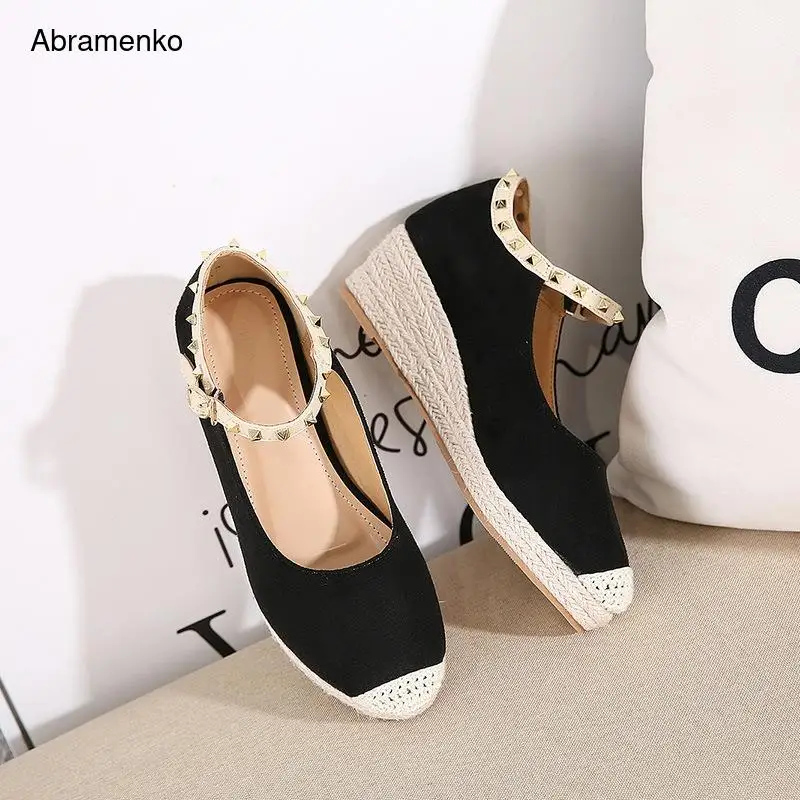 Сандалии женские холщовые с заклепками, босоножки на танкетке, закрытый носок, ремешок на щиколотке, средний каблук, туфли-лодочки на платформе, Повседневная летняя обувь, Размеры 35-41