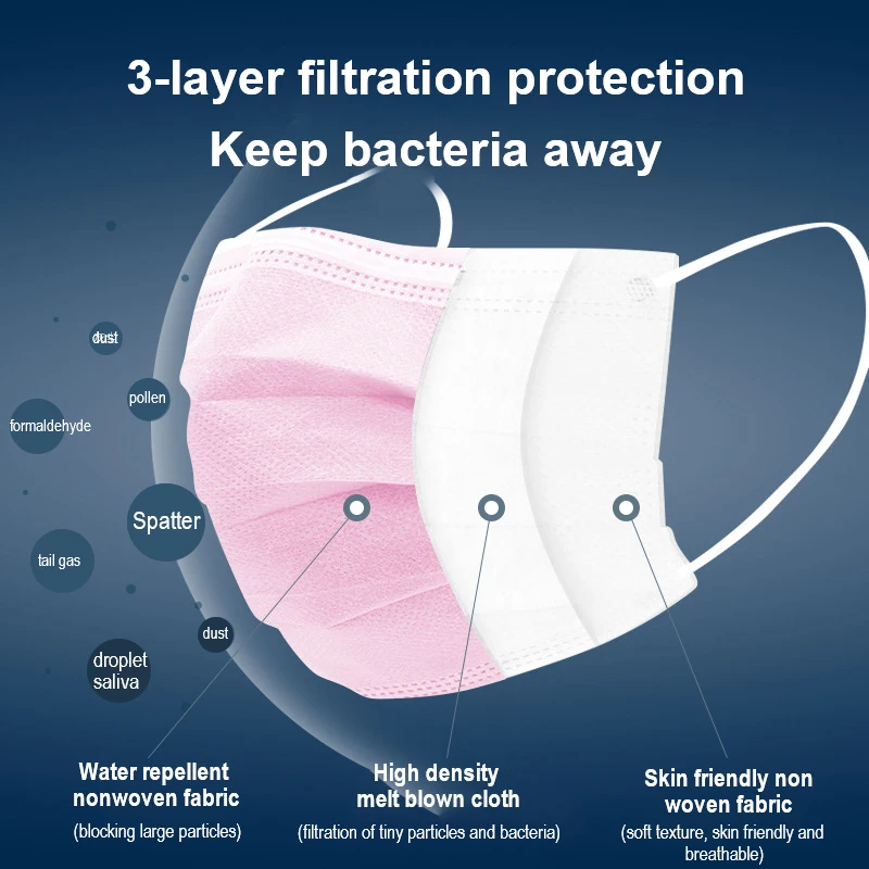 1,3 слоев защиты. Внешний слой: нетканый (предотвращает попадание пыли в пену). Средний слой: медицинская ткань из мелтблауна выше 95 уровня. Трехмерная сетчатая структура фильтра. Фильтрует более 95% бактерий. Внутренний слой: нетканый (мягкий, дышащий, приятный для кожи).
