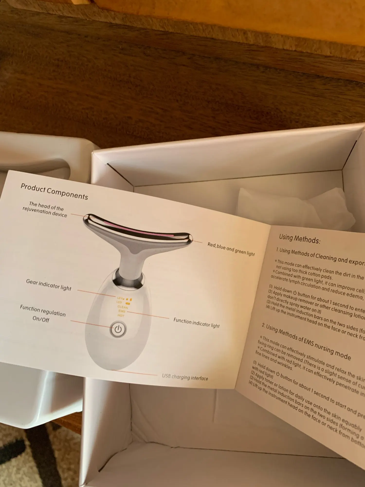 При включении не совсем понятен принцип действия данного прибора. Есть 3 режима. Инструкция не сильно большая, но разобраться можно. Основано на биоэлектродах. Вроде как должен разглаживать не только подбородок, но и неровности на лице. Перед использованием обязательно прочитайте инструкцию.