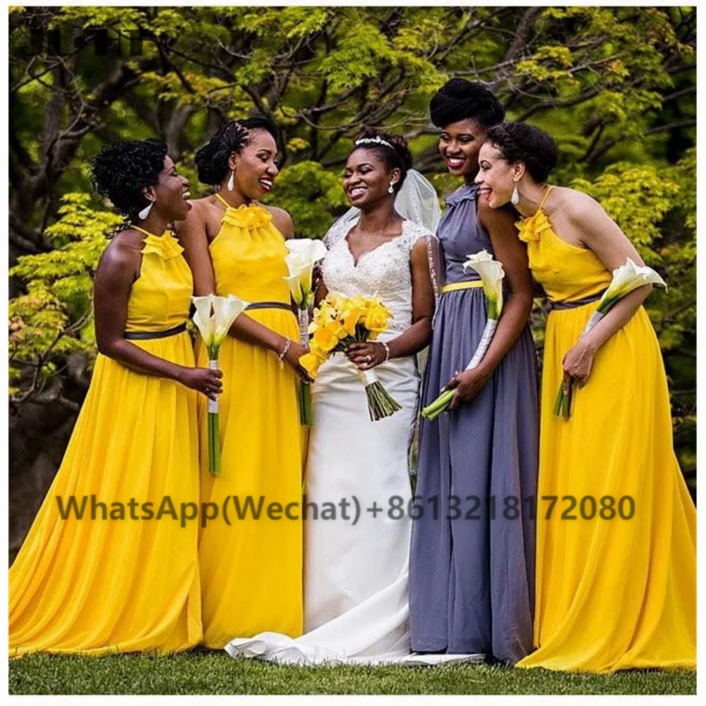Платье подружки невесты с лямкой на шее, желтое шифоновое черное платье для подружки невесты с цветочным узором, платье для подружки невесты для женщин, 2021