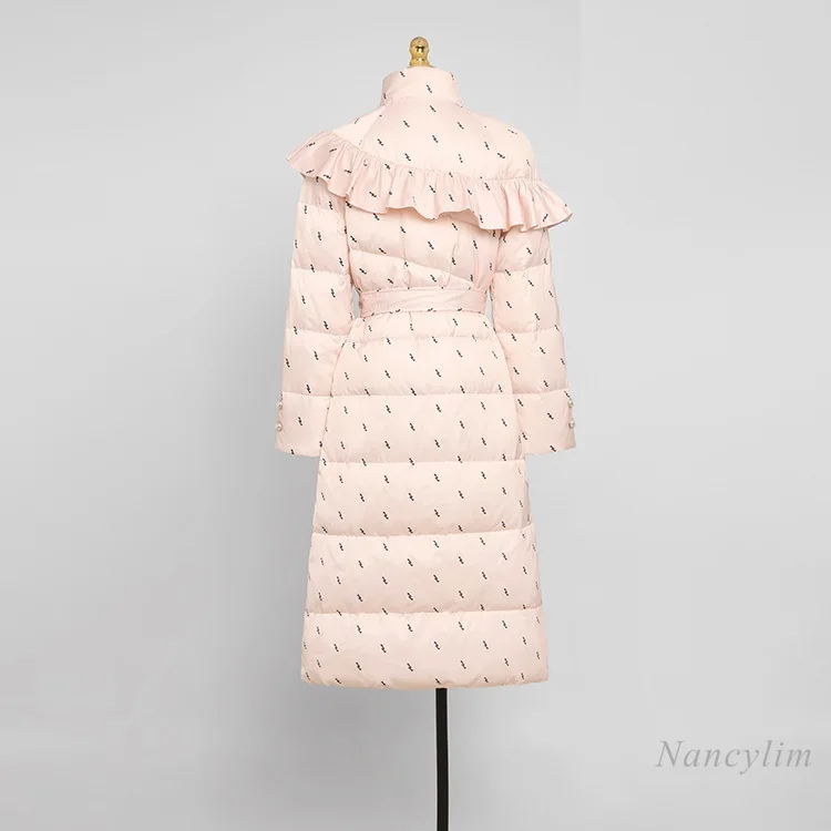 Женский длинный пуховик с оборками, теплая куртка на белом утином пуху с принтом букв и косыми плечами, новинка зимы 2020