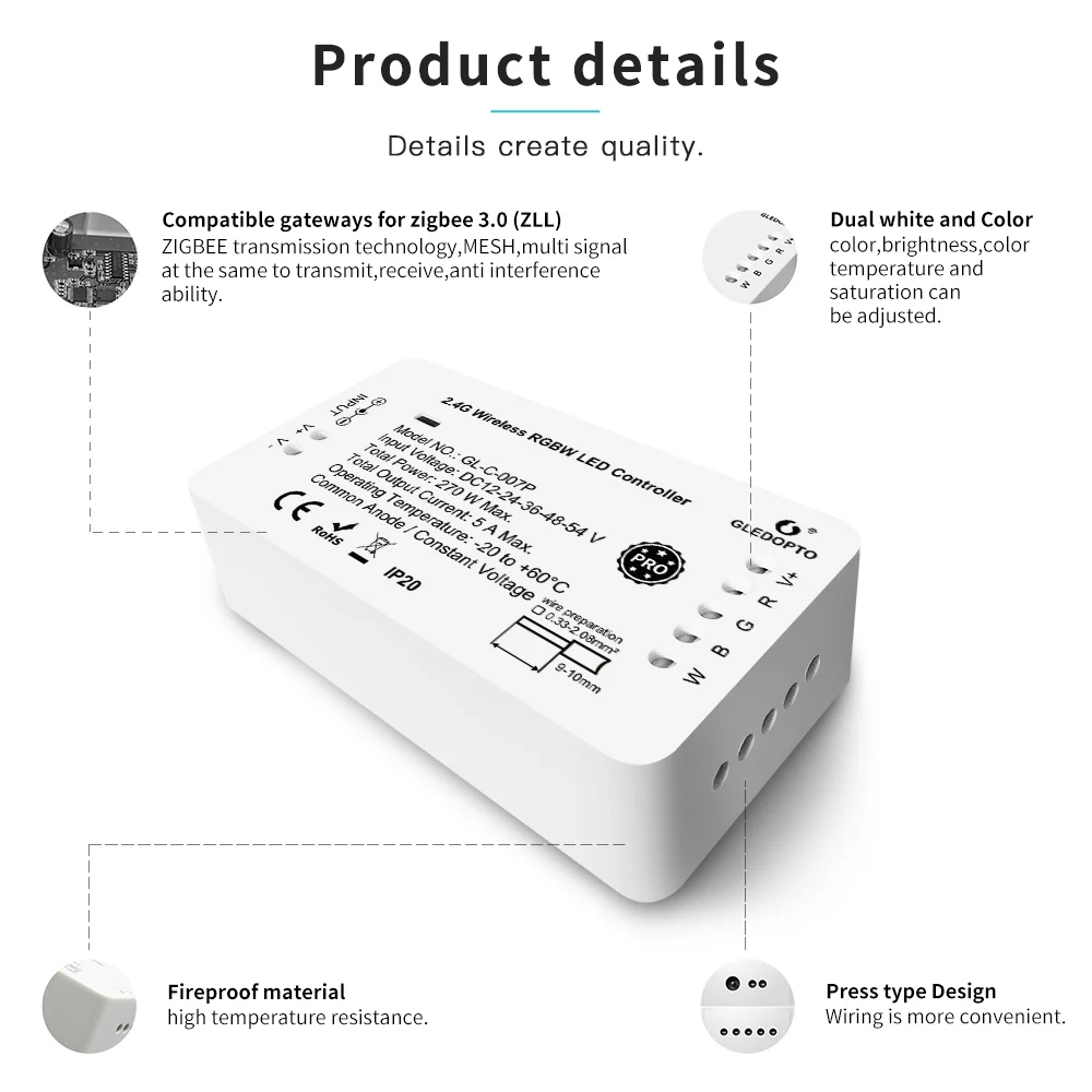 Светодиодный контроллер GLEDOPTO ZIGBEE 3,0 12 В 24 В постоянного тока Smart Pro RGBW ZIGBEE работает с пультом дистанционного управления 2,4G RF Amazon Echo Plus Smartthings