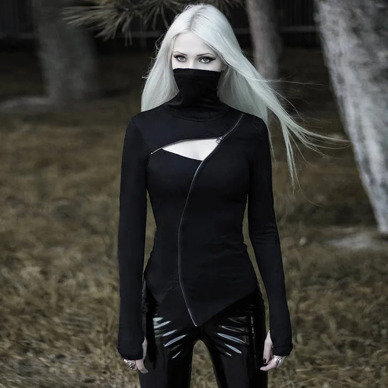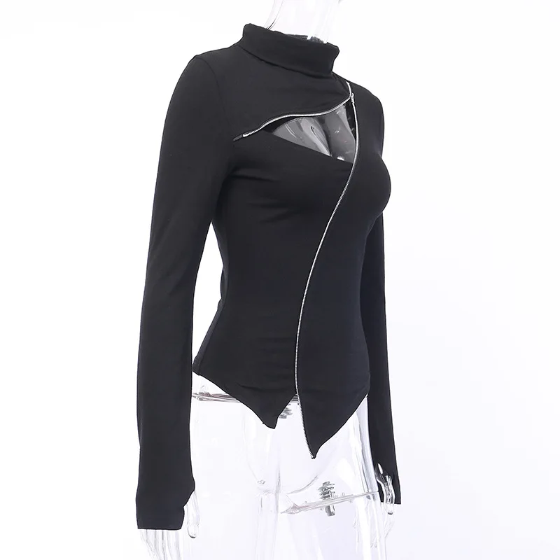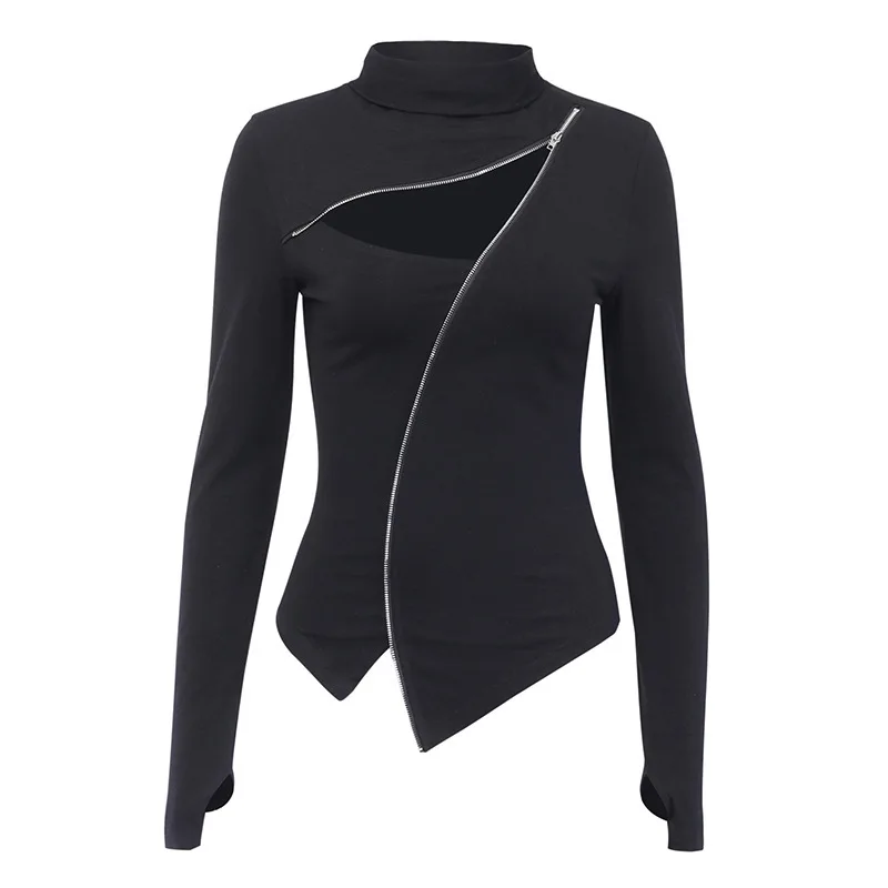 Женская футболка с длинным рукавом Turleneck, черная, на молнии, с вырезами, в готическом стиле, уличная одежда, сексуальный готический Топ для вечеринок