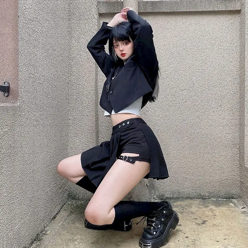 Осень 2022, новый комплект из 2 предметов, Женский тёмный костюм в стиле ретро, черный маленький костюм, Блейзер, куртка, плиссированная юбка, японская мода