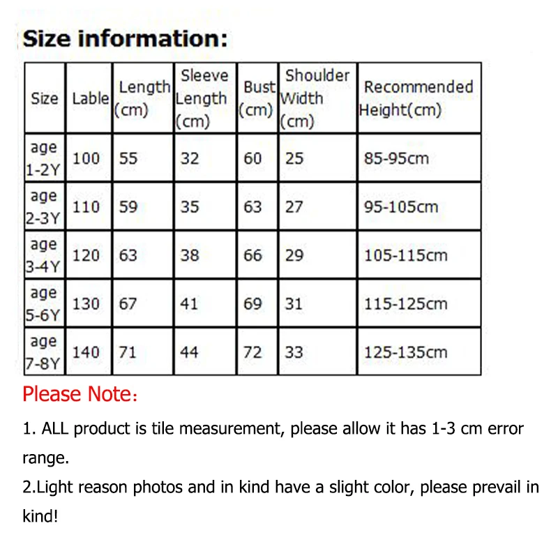 РазмерыЛаблеДлина (см)Длина рукава (см)Бюст (см)Ширина плеч (см)Рекомендуемая высота (см)Возраст От 1 до 2 лет1005532602585-95 смВозраст От 2 до 3 лет1105935632795-105 смВозраст От 3 до 4 лет12063386629105-115 смВозраст От 5 до 6 лет13067416931115-125 смВозраст От 7 до 8 лет14071447233125-135 см Обратите внимание: 1. Все продукты являются измерениями плитки, пожалуйста, учитывайте погрешность в 1-3 см. 2. Пожалуйста, при покупке выбирайте размер в соответствии с таблицей размеров. Если вы не понимаете их, пожалуйста, свяжитесь с нами. Сообщите нам вес и рост ваших детей. Мы поможем вам сделать лучший выбор. 3. Светильник причина фотографии и в натуральной форме, у вас есть s светильник цвет, просим отнестись к этому с пониманием!