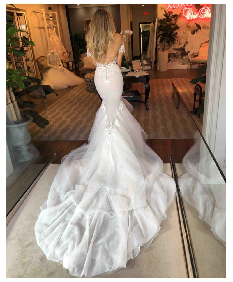 Женское свадебное платье с юбкой-годе, открытыми плечами и шлейфом