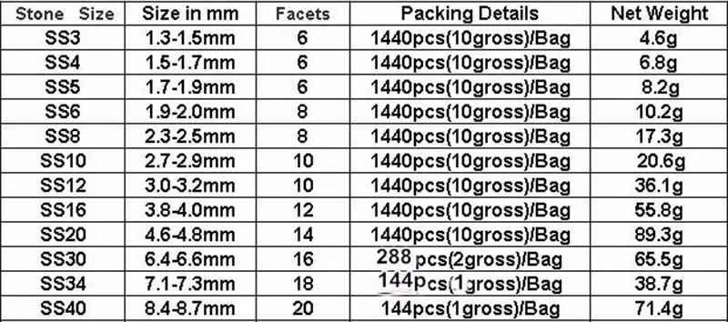 Strass Sizesss3 ss4 ss5 ss6 ss8 ss10 ss12 ss16 ss20 ss30 ss34