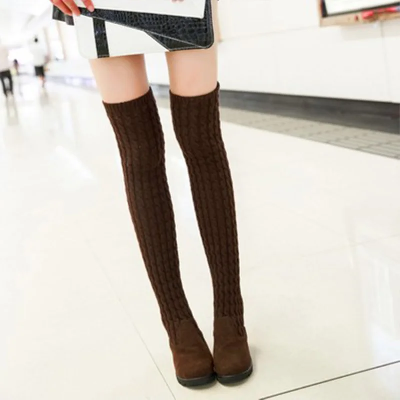 Тянущихся тканей ботфорты выше колена новые вязанная шерстяная обувь круглый носок, женская обувь, теплые сапоги осень-зима Повседневные высокие сапоги с украшением-Размеры 41
