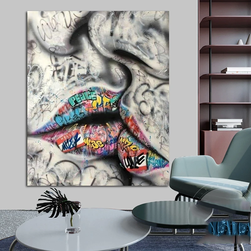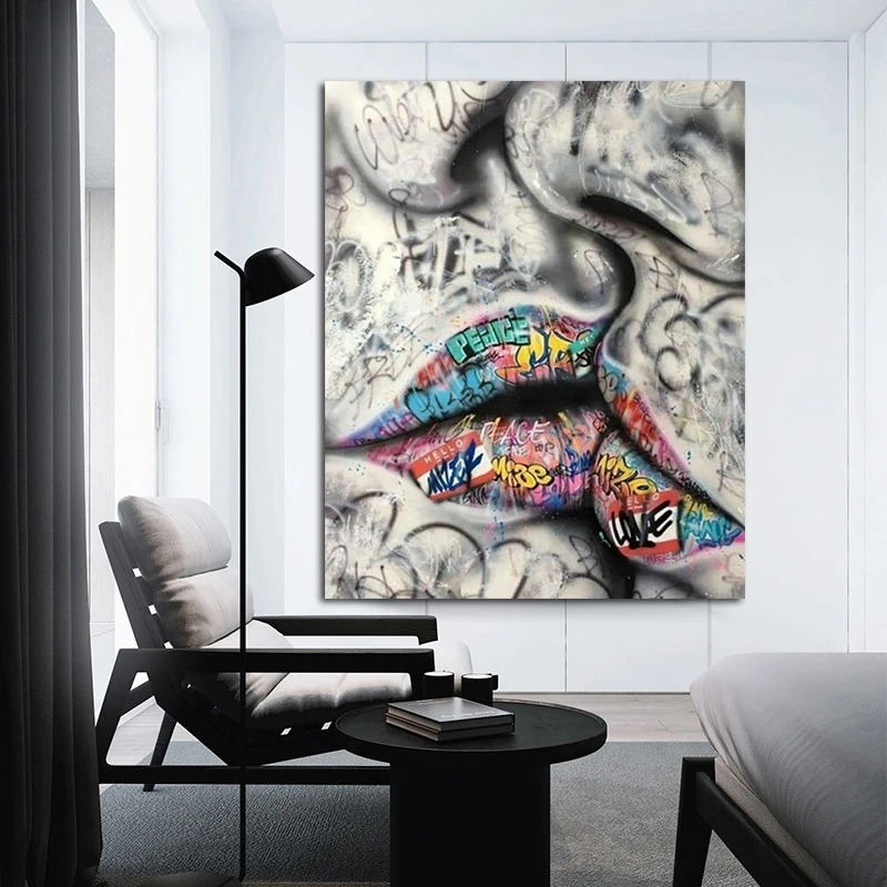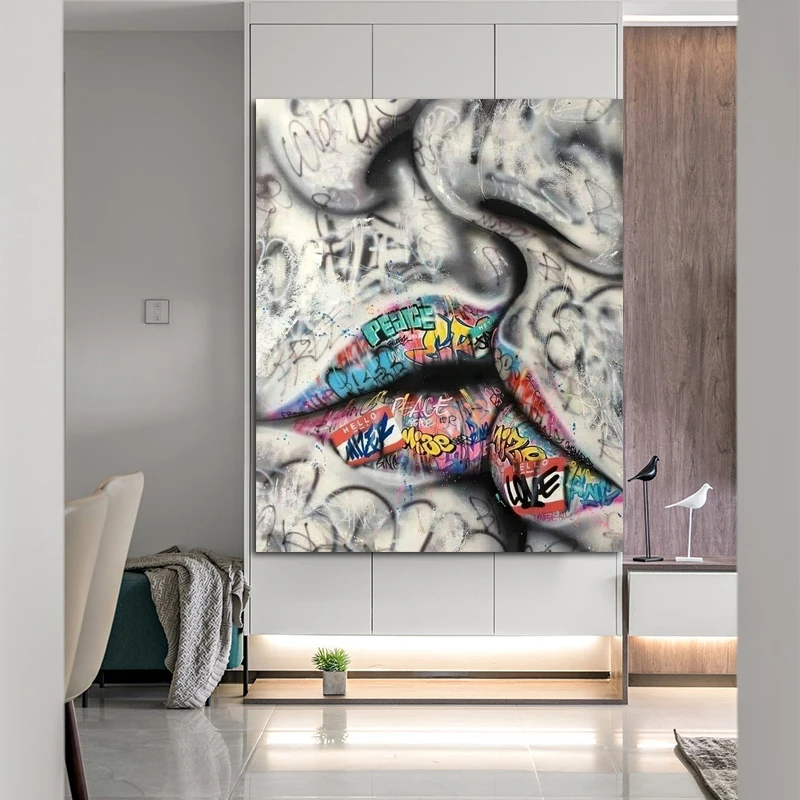 Картина маслом большого размера, любовник, поцелуй, улица, граффити, холст, постер, абстрактный Рисунок, Настенная картина для гостиной
