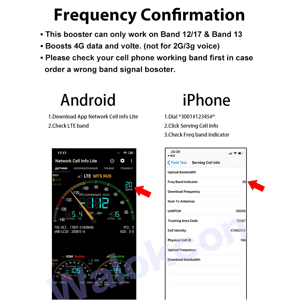 Прежде чем купить этот усилитель сигнала, пожалуйста, выходите на улицу и используйте свой мобильный телефон для обнаружения диапазона частот. Убедитесь, что усилитель сигнала совместим с оператором на мобильный телефон. Если вы покупаете не тот усилитель сигнала, он не будет работать.