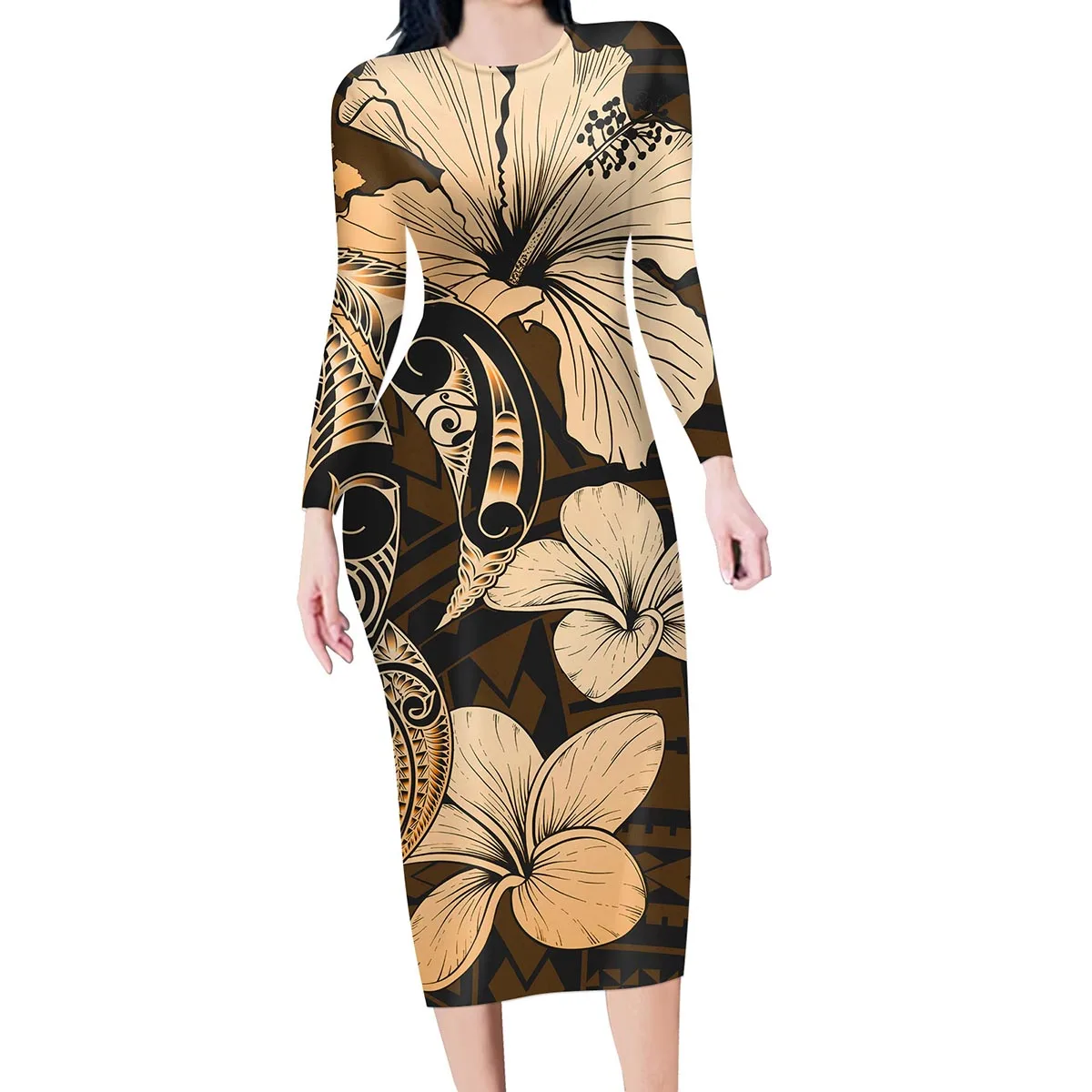Женское платье с цветочным принтом, круглым вырезом и длинным рукавом