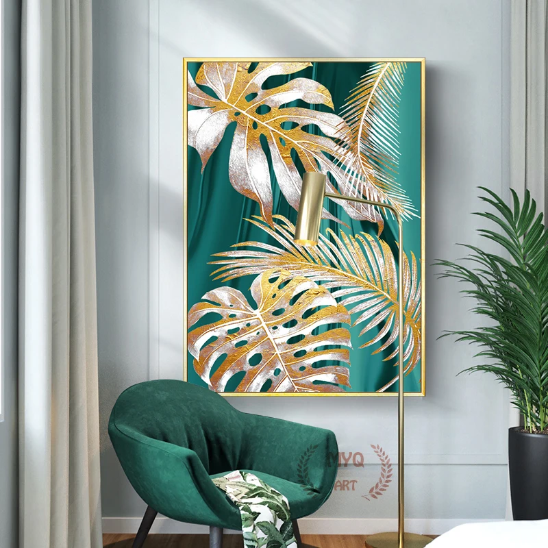 Абстрактный плакат синего, зеленого, желтого, золотого цветов с изображением листьев растений, скандинавский настенный художественный Декор для гостиной