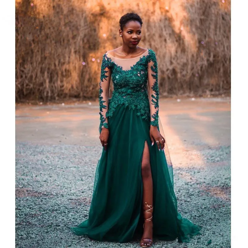 Изумрудно-зеленые тюлевые официальные платья для выпускного вечера 2020, Длинные вечерние платья-трапеции в африканском стиле, длинное вечернее платье с блестящими аппликациями и разрезом для ног